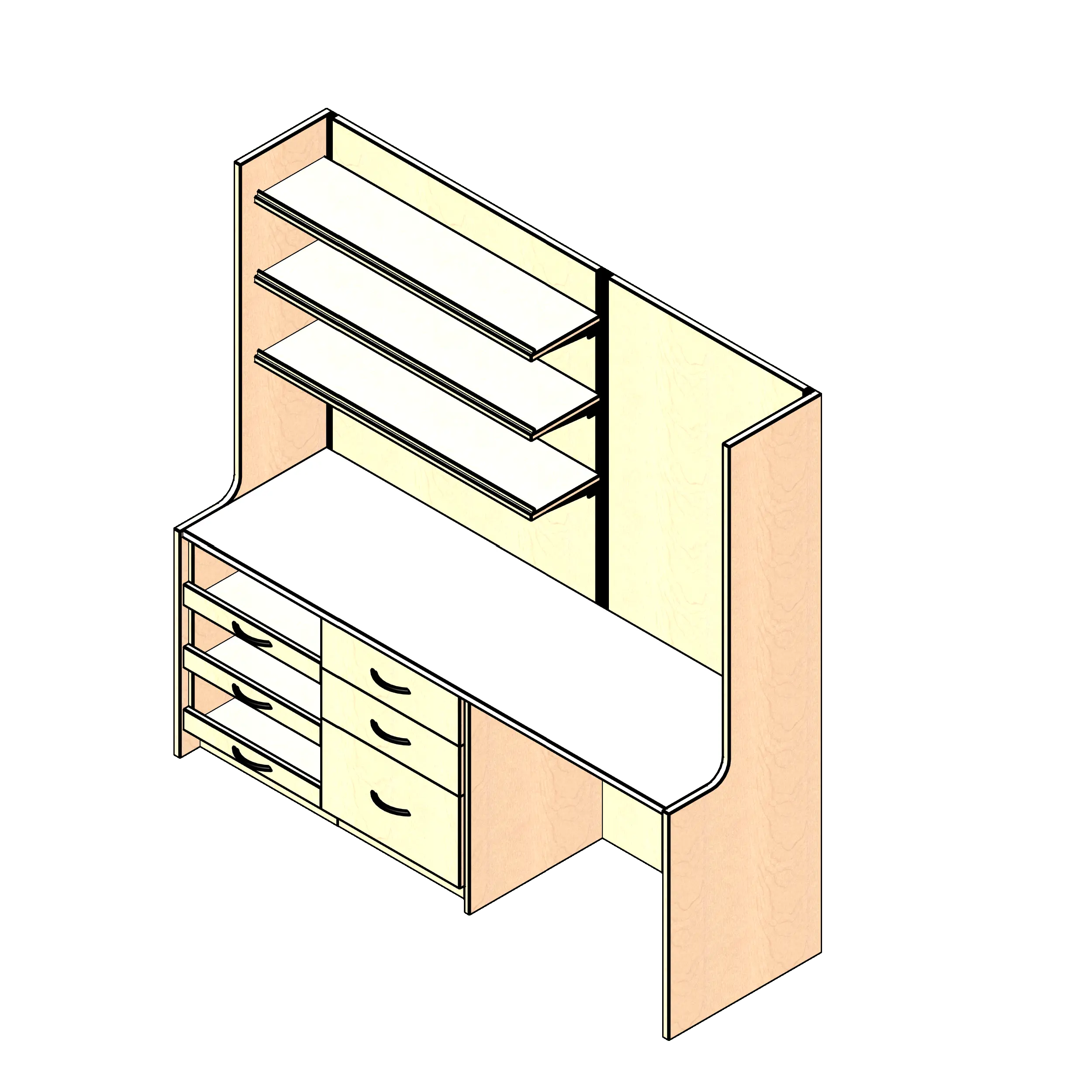 • Kit includes one tray drawer base cabinet, one box box file, one open knee space cabinet, one countertop, three adjustable shelves, two back panels, and two side panels.