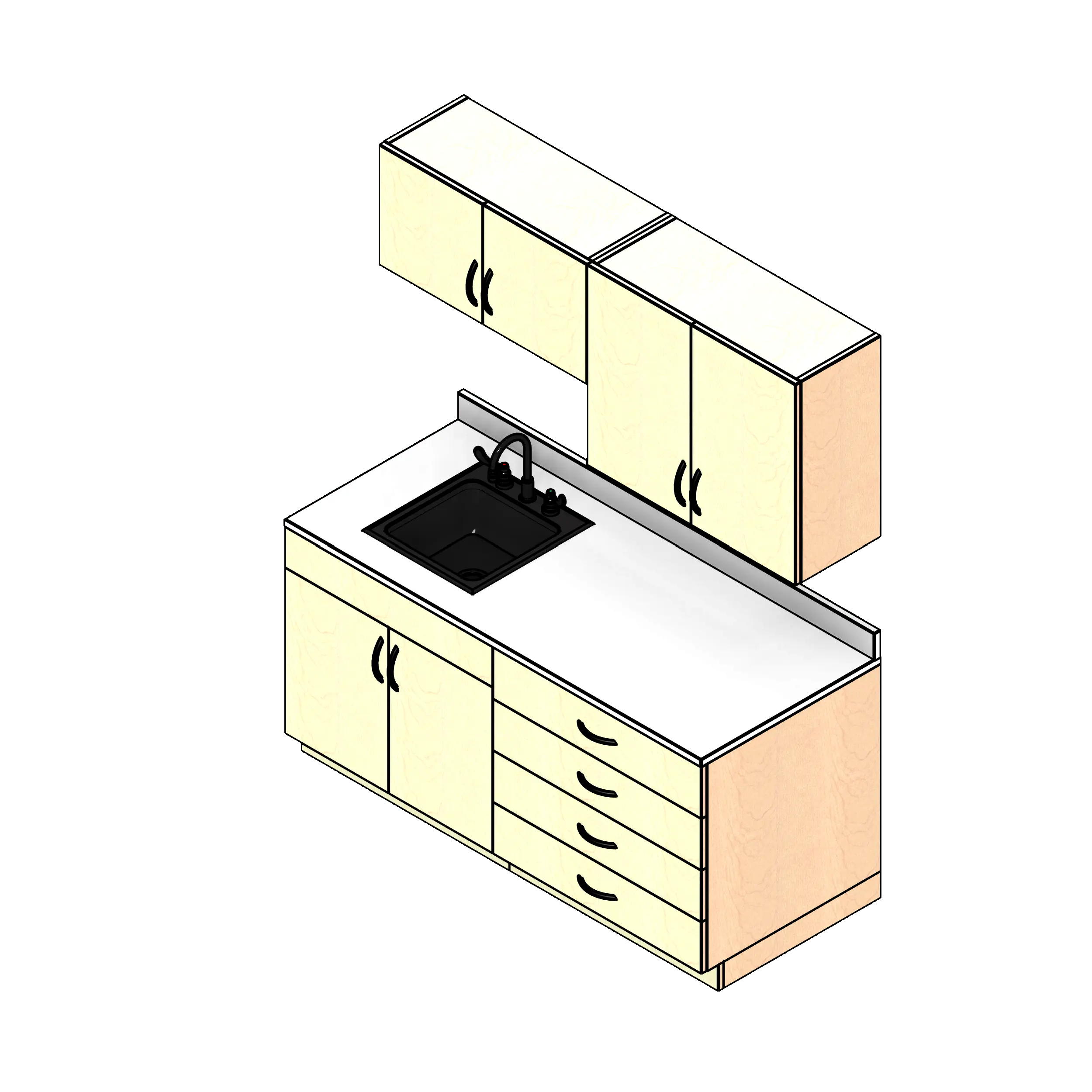 - Kit includes two base cabinets, two upper wall cabinets, one countertop with backsplash, and one sink with faucet.