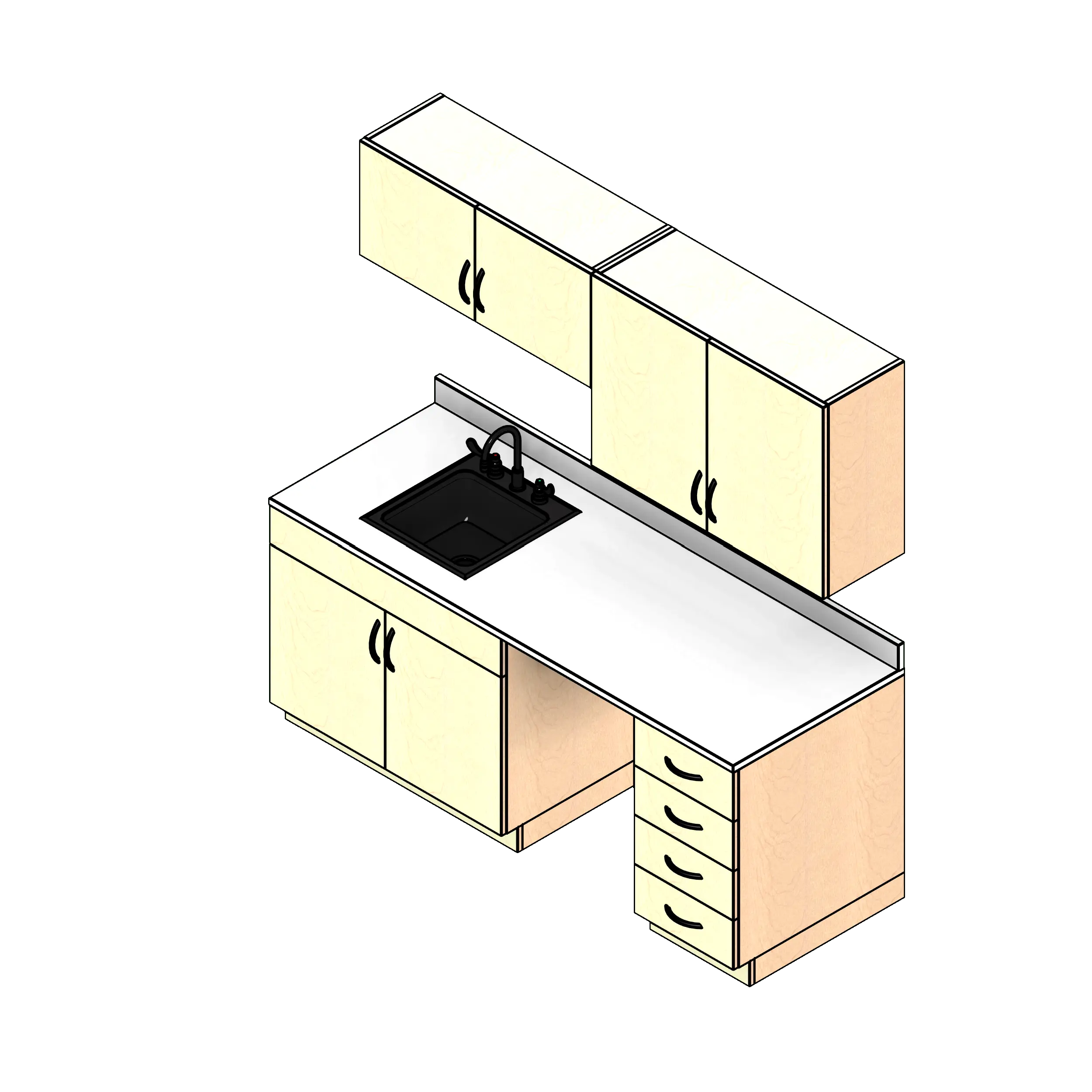 • Kit includes two base cabinets, two upper wall cabinets, one countertop with backsplash, and one sink with faucet.