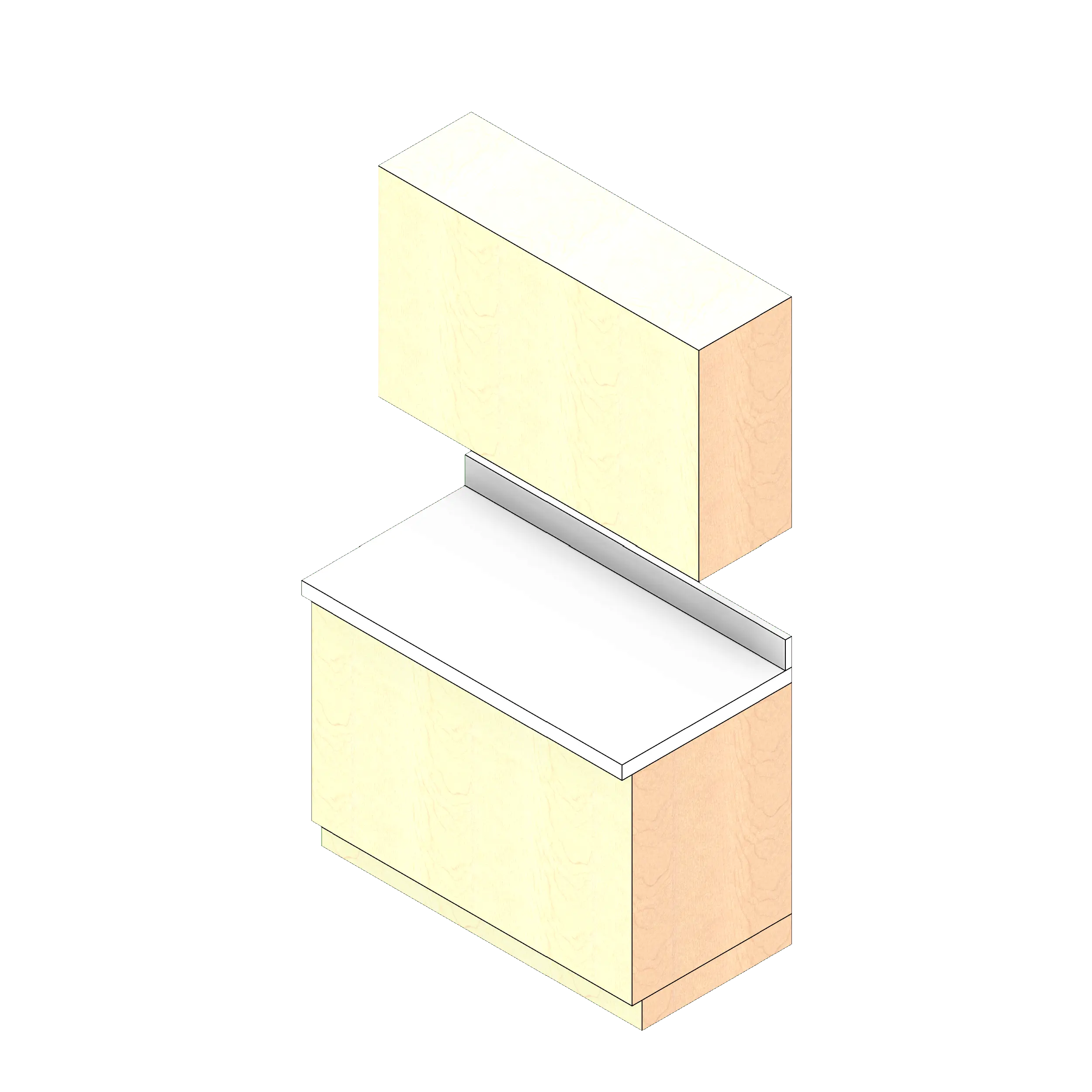 This casework model is a line-based family. To use, insert the family and draw a line the length of your intended casework group. The model will insert with the back of the casework on the line. Adjust your desired dimensions in the Dimensions category in the property browser. Use the checkboxes in the construction category of the properties browser to view or hide additional options, such as counter overhangs, backsplash, top cabinets, and top types.