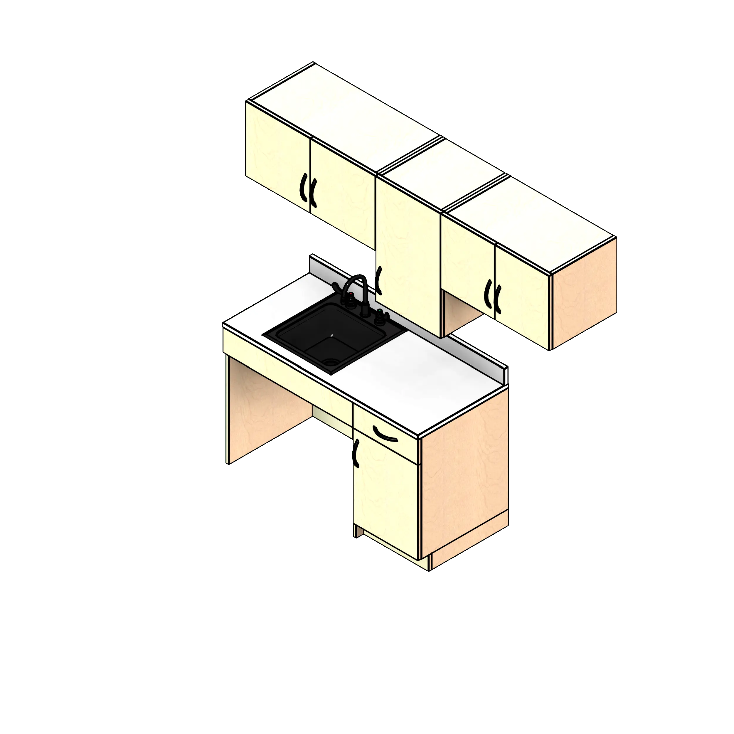 - Kit includes two base cabinets, three upper wall cabinets, one countertop with backsplash, and one sink with faucet.