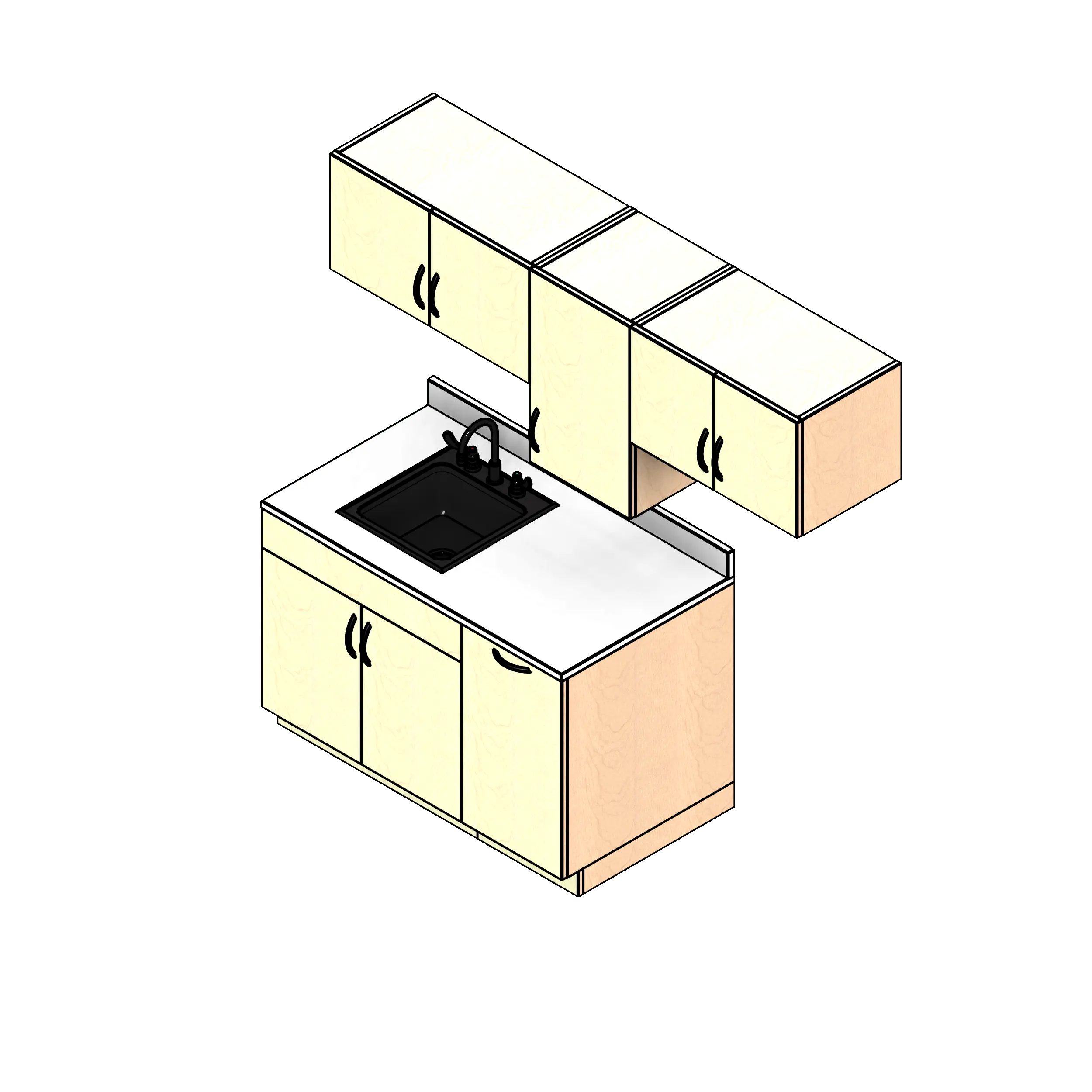 - Kit includes two base cabinets, three upper wall cabinets, one countertop with backsplash, and one sink with faucet.