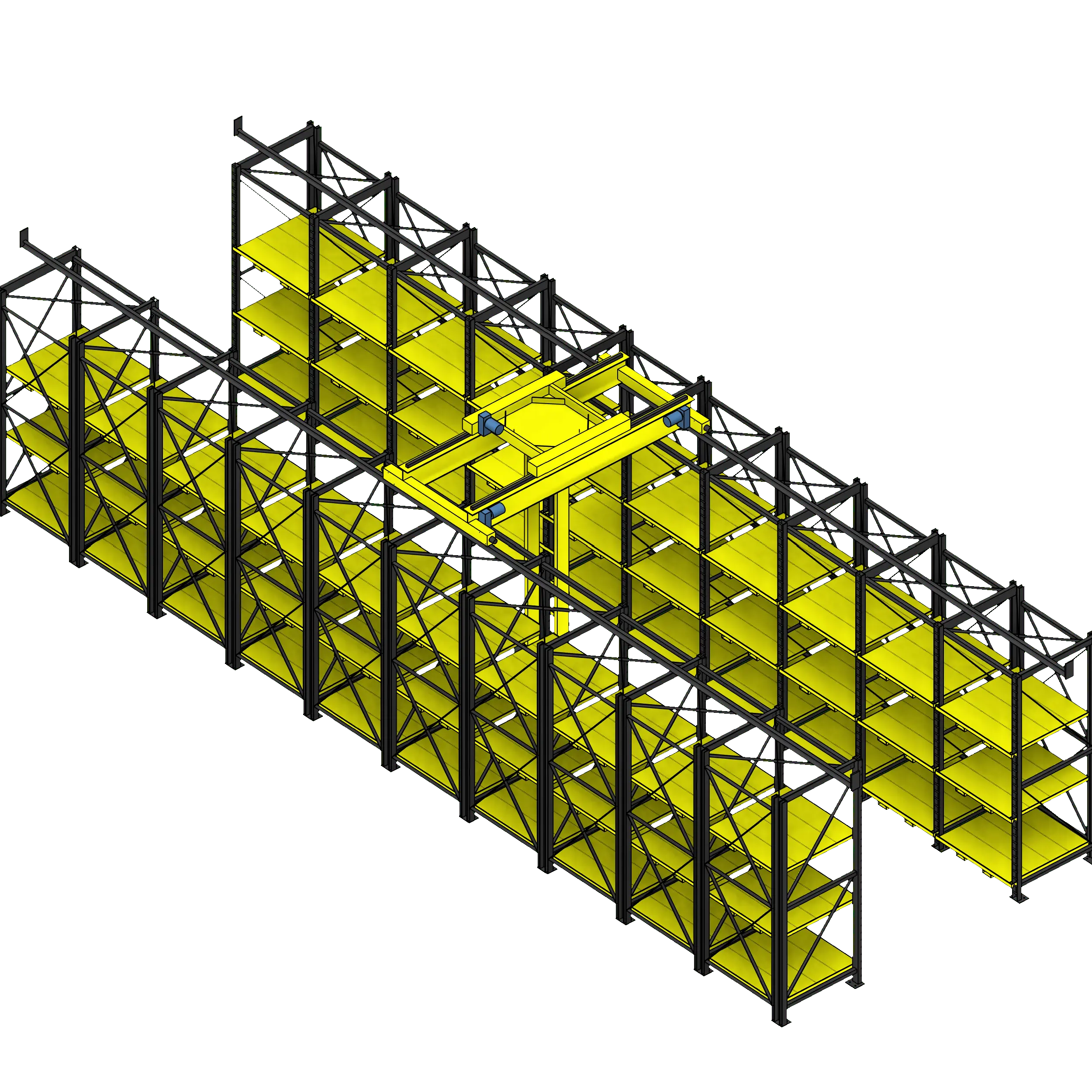 This ingenious storage system consists of instantly adjustable pallet racks and a robust gantry crane. The pallet racks work with special steel pallets that slot directly into the rack using tabs on the back of the pallet and the pins in the frame upright; this allows for pallets to be stacked as tightly as possible without wasted air space above or below traditional fixed beam pallet racks. The pallets may be instantly repositioned using the full-length forklift pockets on the bottom of each pallet.