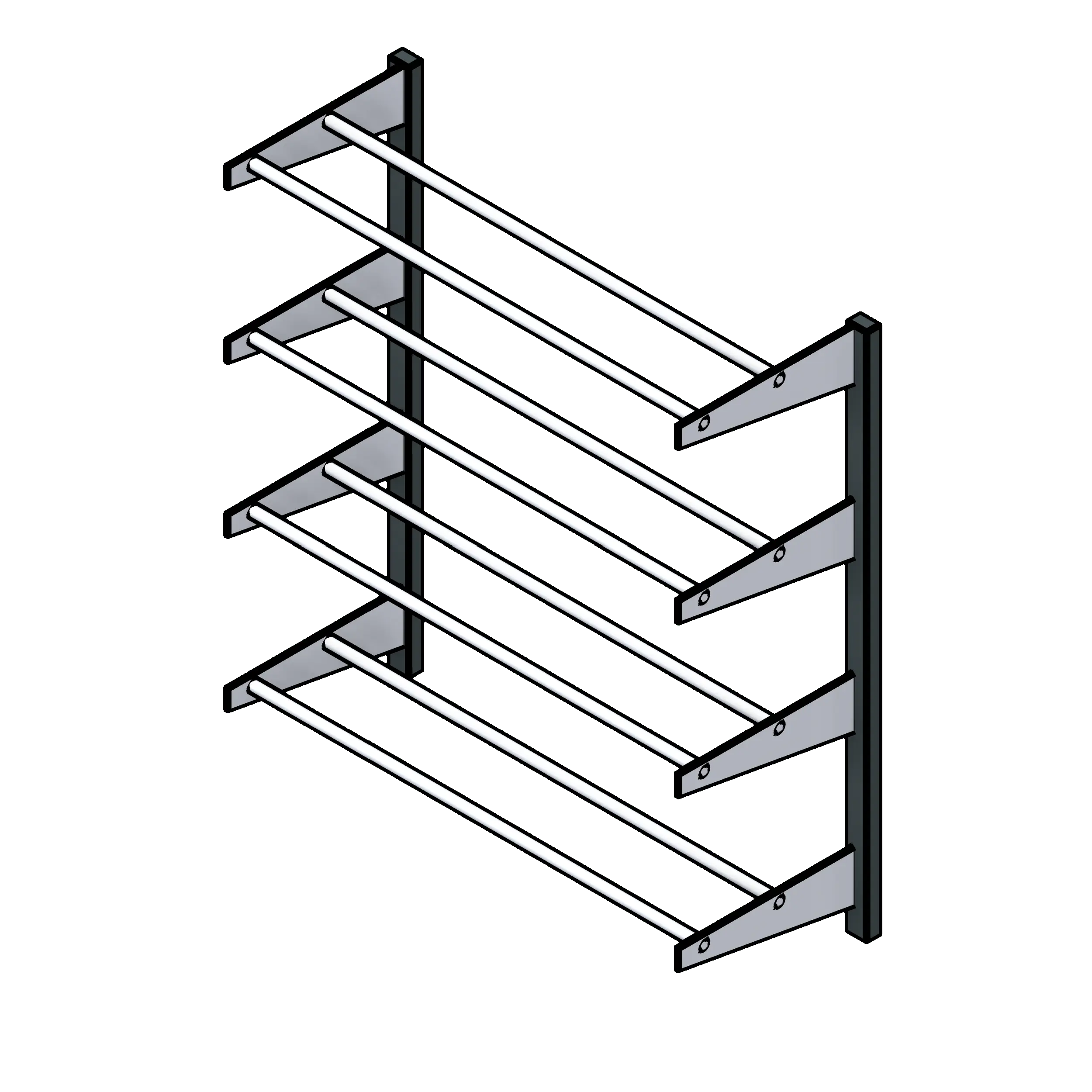 This cantilevered rack efficiently stores basketballs, volleyballs, and other athletic equipment. This convenient shelving system can also store football shoulder pads and other athletic equipment.