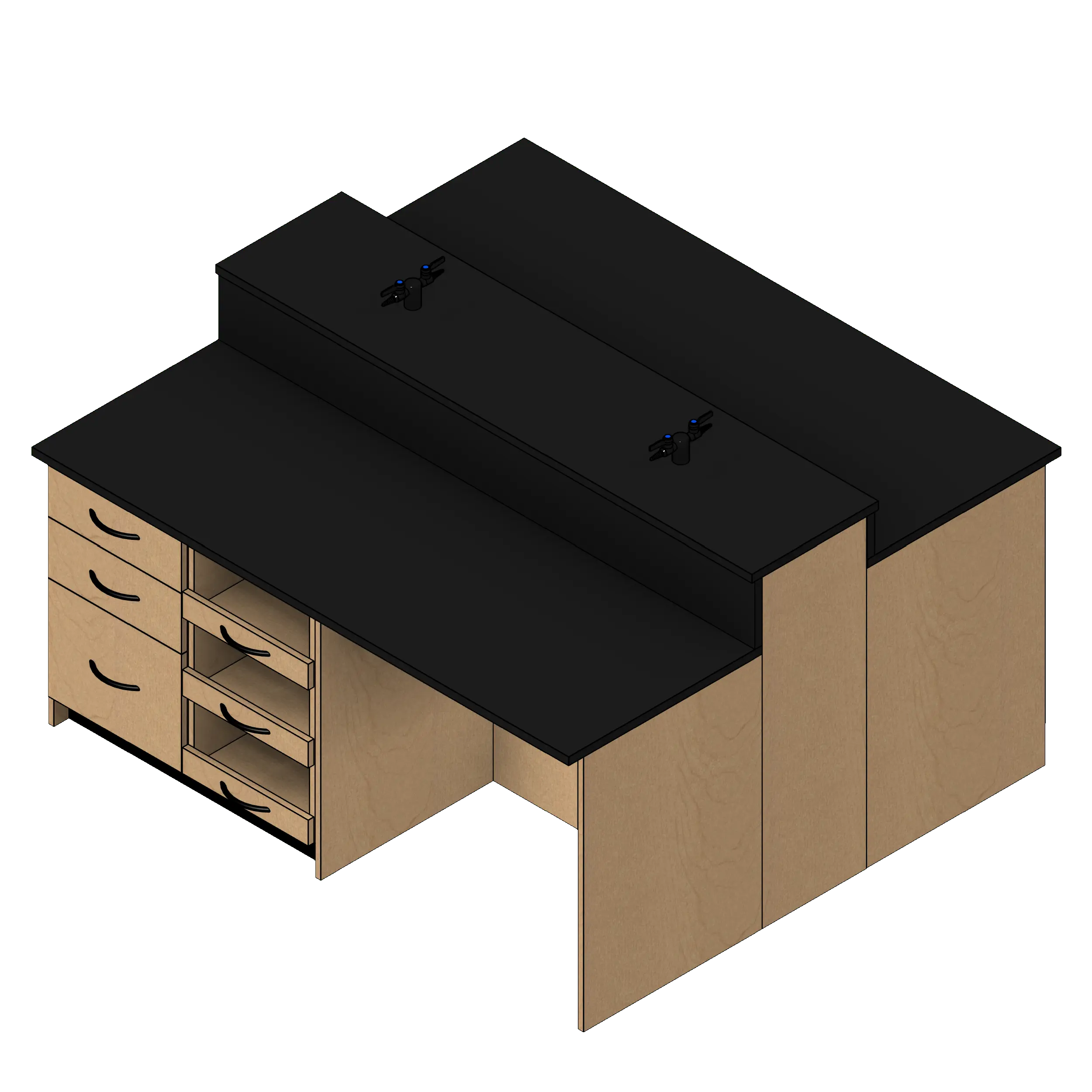 - Kit includes two open knee space cabinets, two sliding shelf base cabinets, two box box files, countertops with backsplashes, and two dual head deck mounted gas valves.
