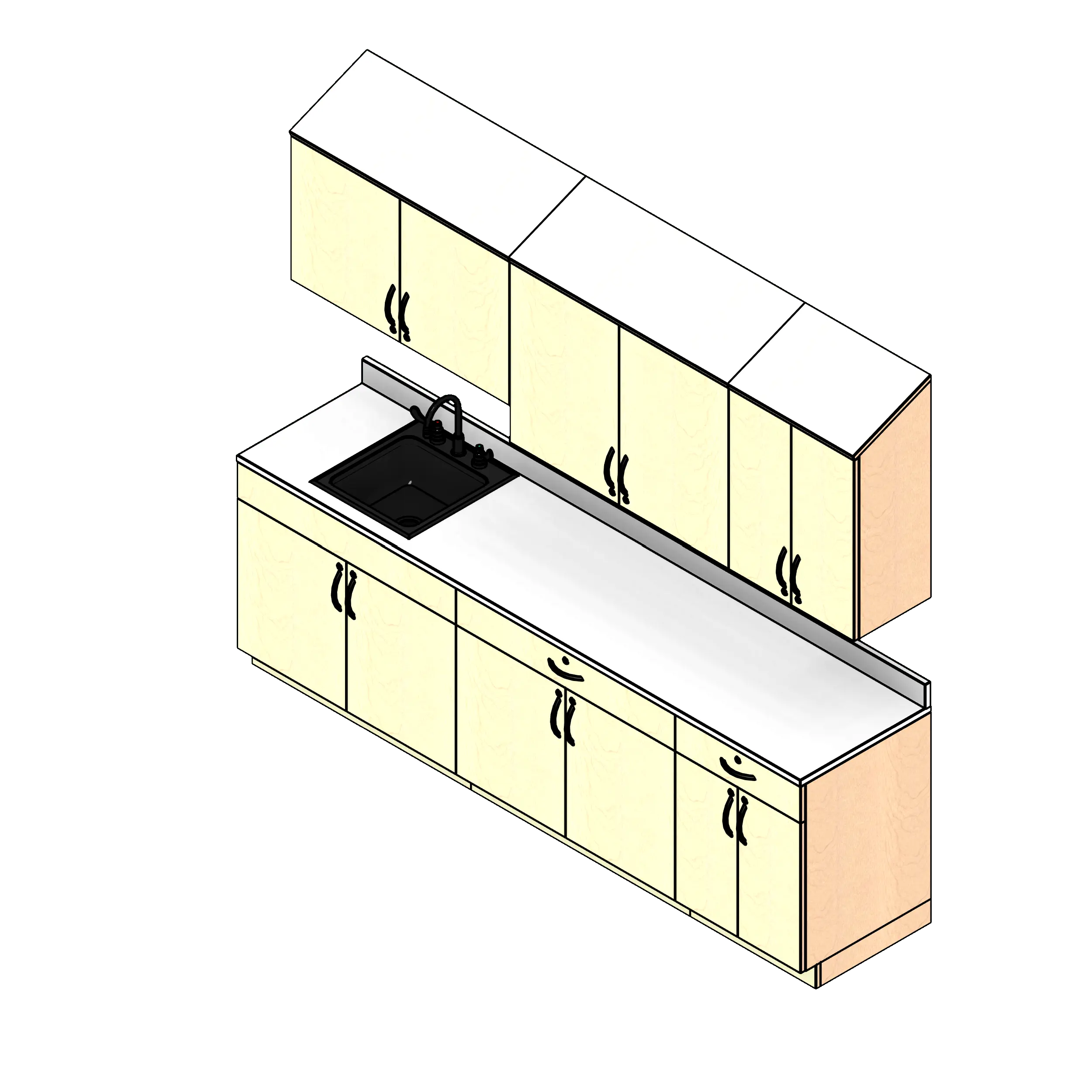 - Kit includes three base cabinets, three upper wall cabinets, one countertop with backsplash, and one sink with faucet.