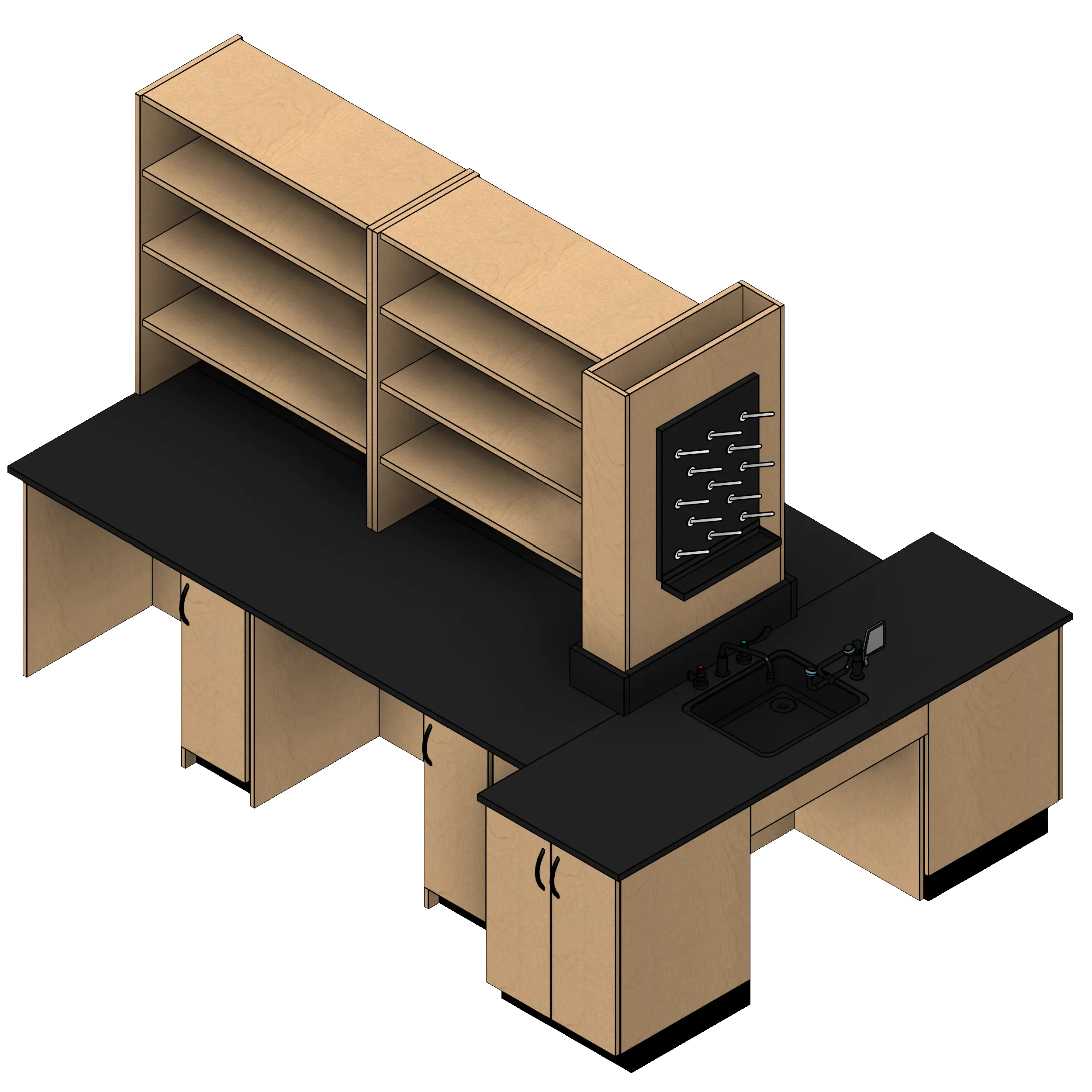 • Kit includes four open knee space cabinets, four one door base cabinets, two base cabinet fillers, two two door base cabinets, one ADA sink cabinet, one ADA sink with vacuum breaker faucet, one eye wash station, one epoxy pegboard, four wall panels, countertops with backsplashes, and two bulk sorters.