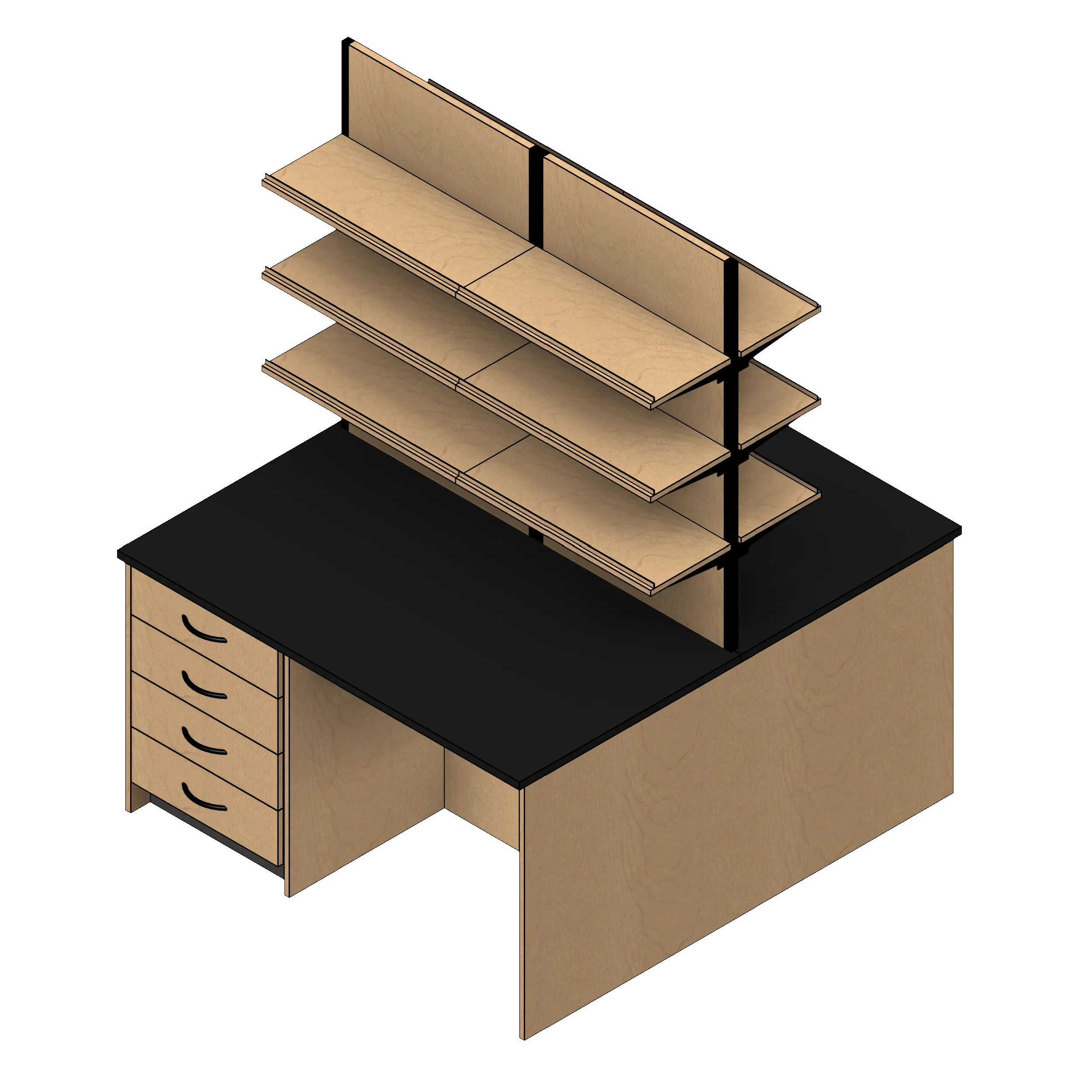 - Kit includes two open knee space base cabinets, two four drawer base cabinets, countertops, and twelve adjustable shelves mounted to two back panels.