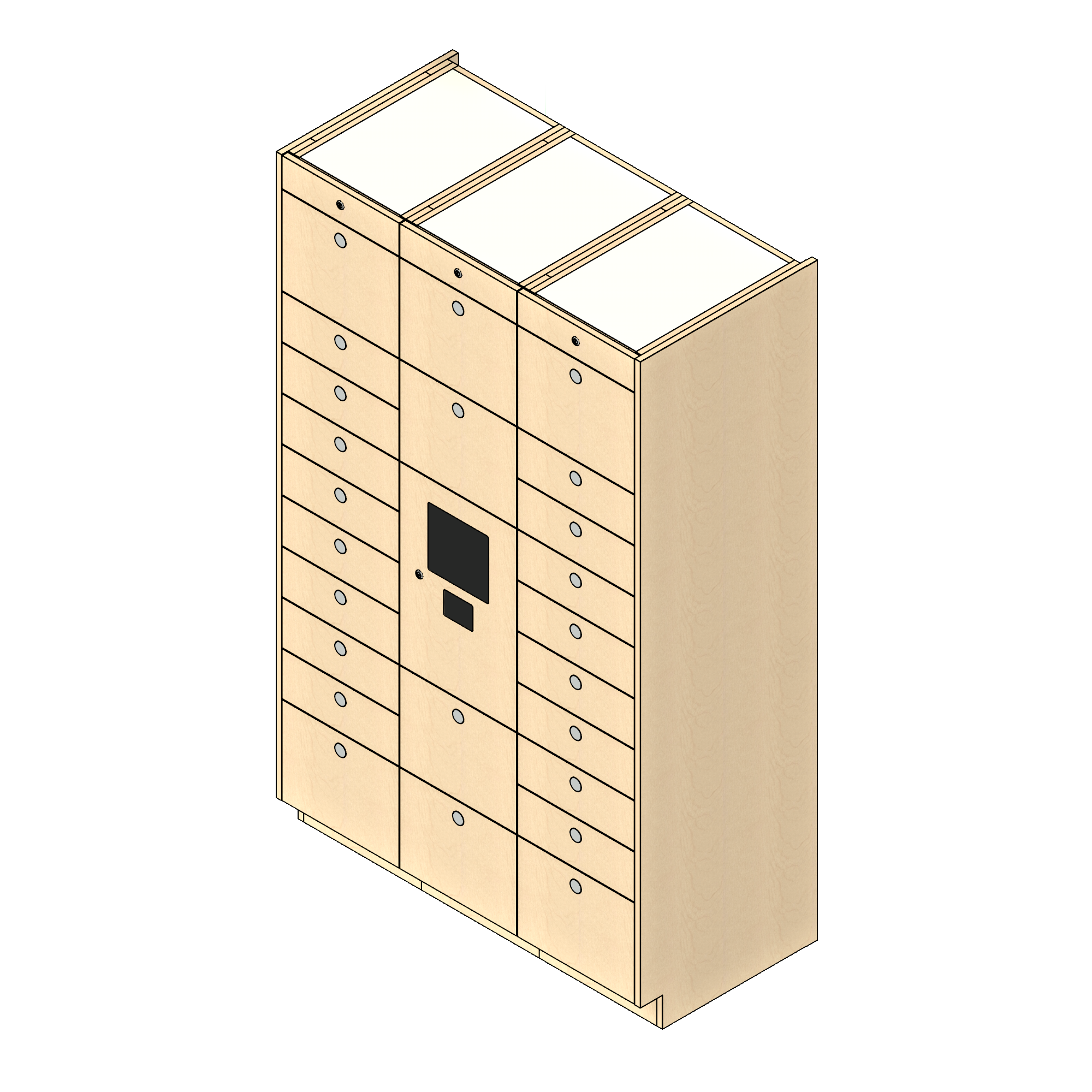 Physically, the smart locker systems consist of a bank of modular lockers, with one of the lockers dedicated to housing the system hardware and power supply. A typical bank of parcel lockers is comprised of columns, with each column consisting of either six small lockers per column, a mixture of five or six small and medium lockers per column, or two large lockers per column. Each column features a proprietary locking raceway that incorporates the required number of smart locking devices for the number of lockers in each column. Electronic locker systems are available in a variety of finishes to complement or match the environments in which they are installed.