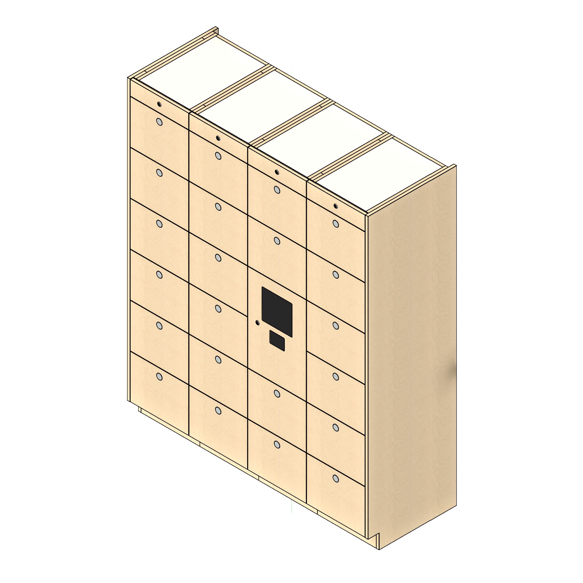 Physically, the smart locker systems consist of a bank of modular lockers, with one of the lockers dedicated to housing the system hardware and power supply. A typical bank of parcel lockers is comprised of columns, with each column consisting of either six small lockers per column, a mixture of five or six small and medium lockers per column, or two large lockers per column. Each column features a proprietary locking raceway that incorporates the required number of smart locking devices for the number of lockers in each column. Electronic locker systems are available in a variety of finishes to complement or match the environments in which they are installed.