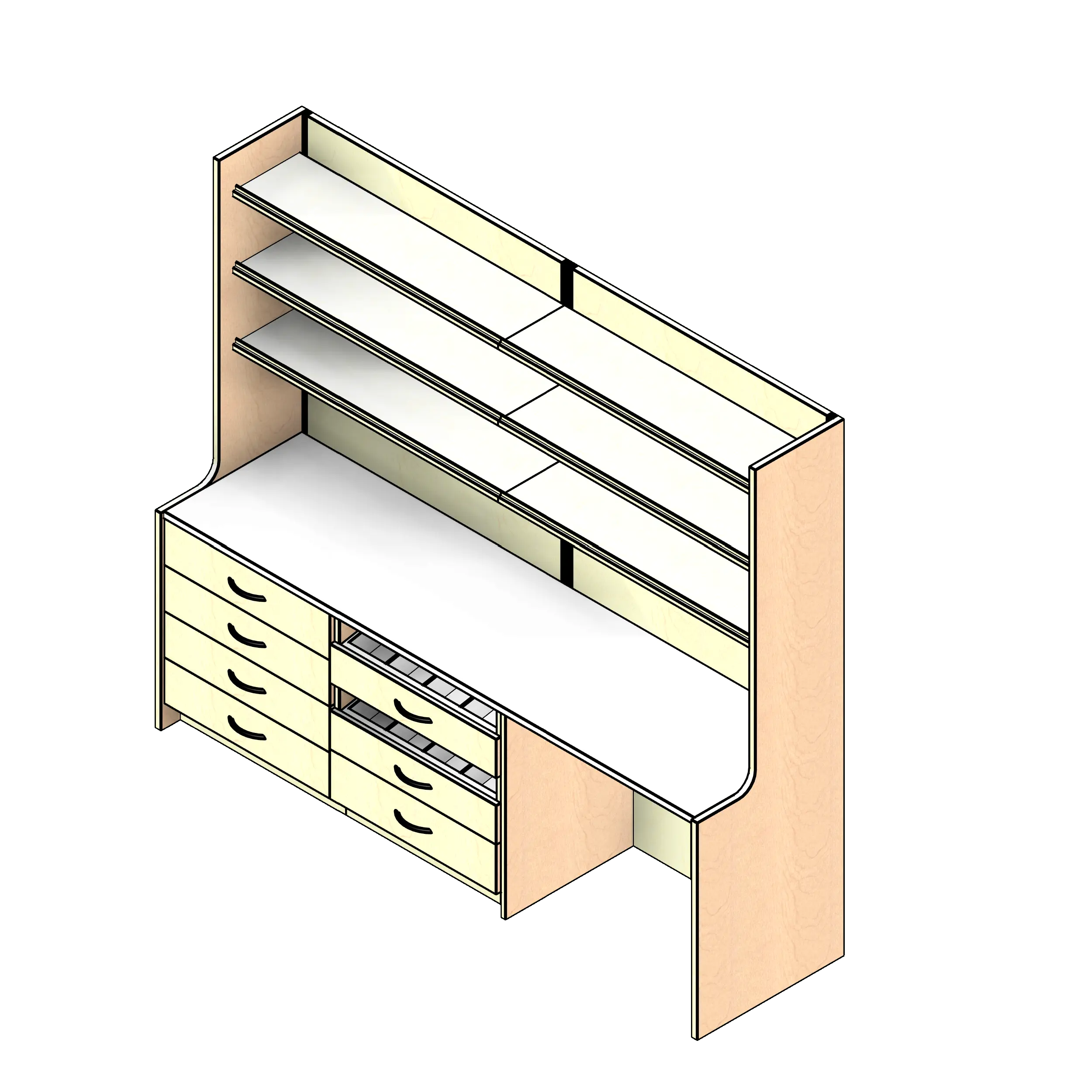 - Kit includes one four drawer indexing base cabinet, one gravity drawer base cabinet, one open knee space cabinet, one countertop, six adjustable shelves, two back panels, and two side panels.