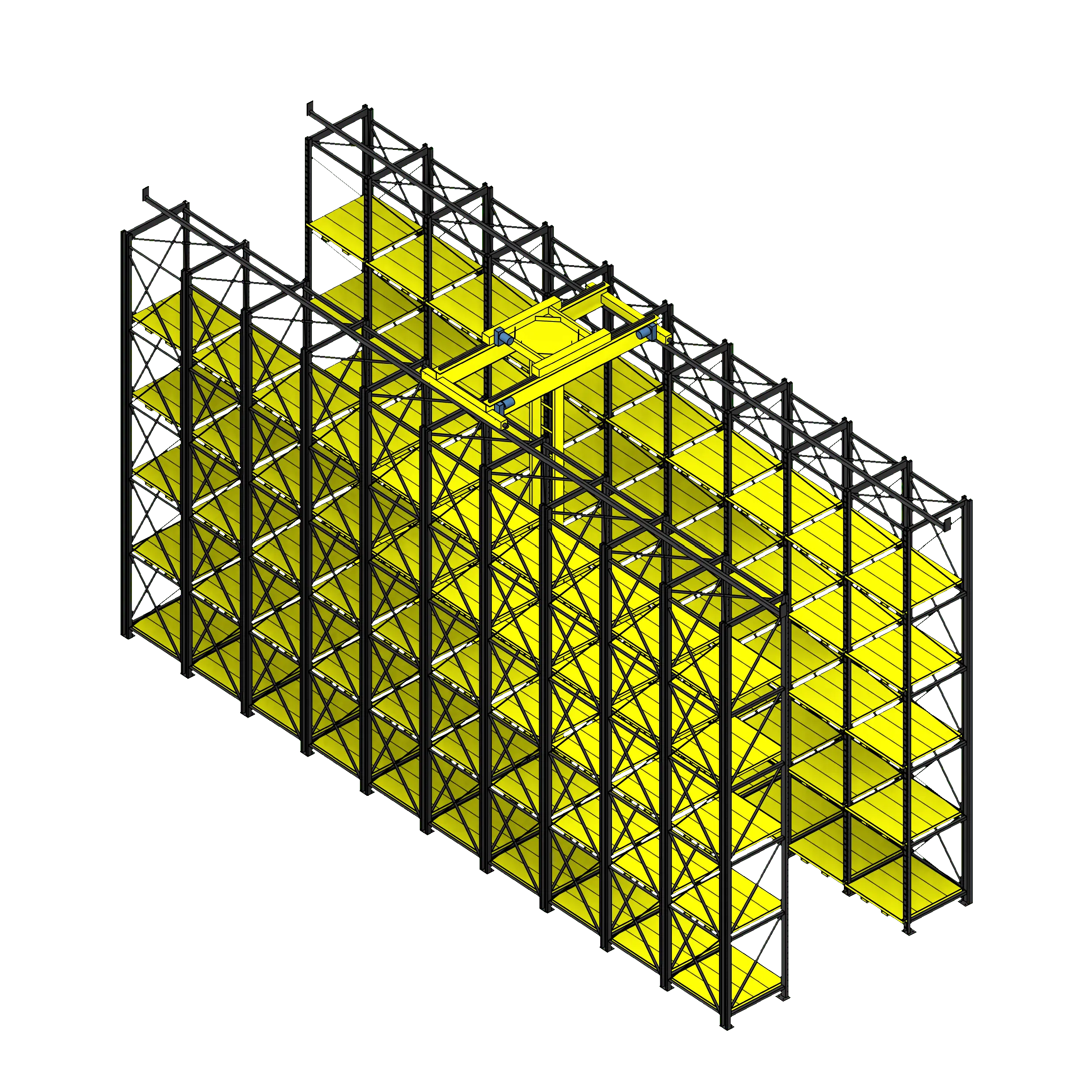 This ingenious storage system consists of instantly adjustable pallet racks and a robust gantry crane. The pallet racks work with special steel pallets that slot directly into the rack using tabs on the back of the pallet and the pins in the frame upright; this allows for pallets to be stacked as tightly as possible without wasted air space above or below traditional fixed beam pallet racks. The pallets may be instantly repositioned using the full-length forklift pockets on the bottom of each pallet.