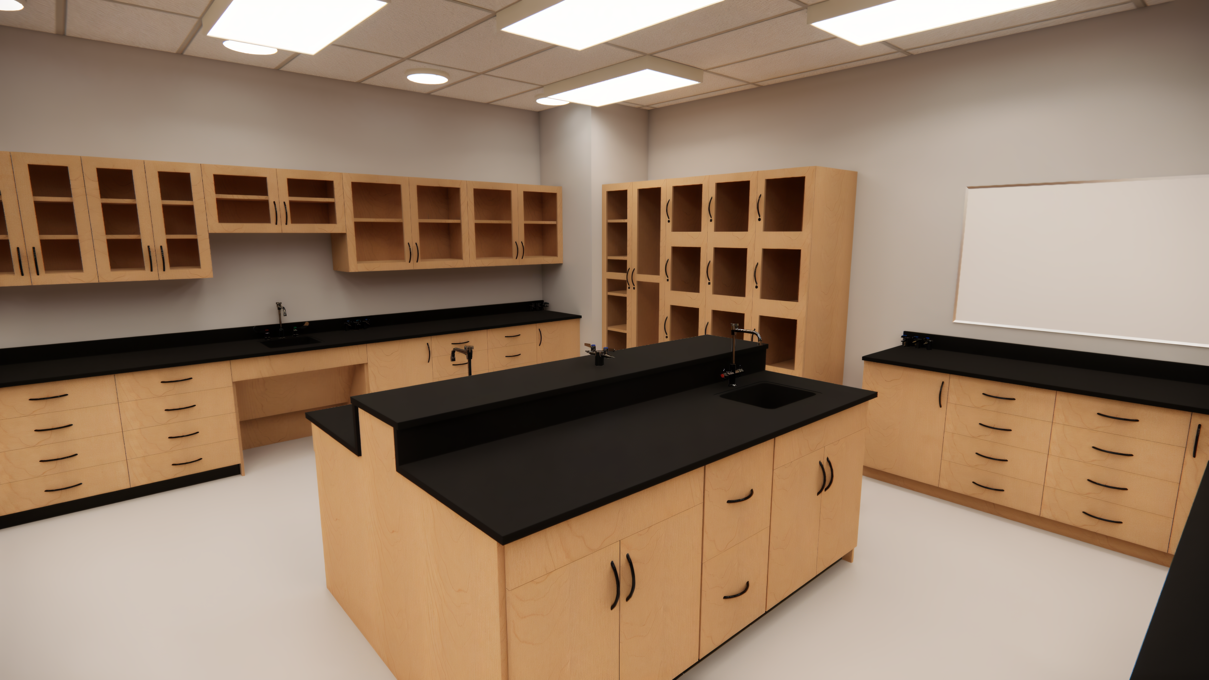 - Durable Casework: Modular lab units with epoxy resin countertops for chemical resistance