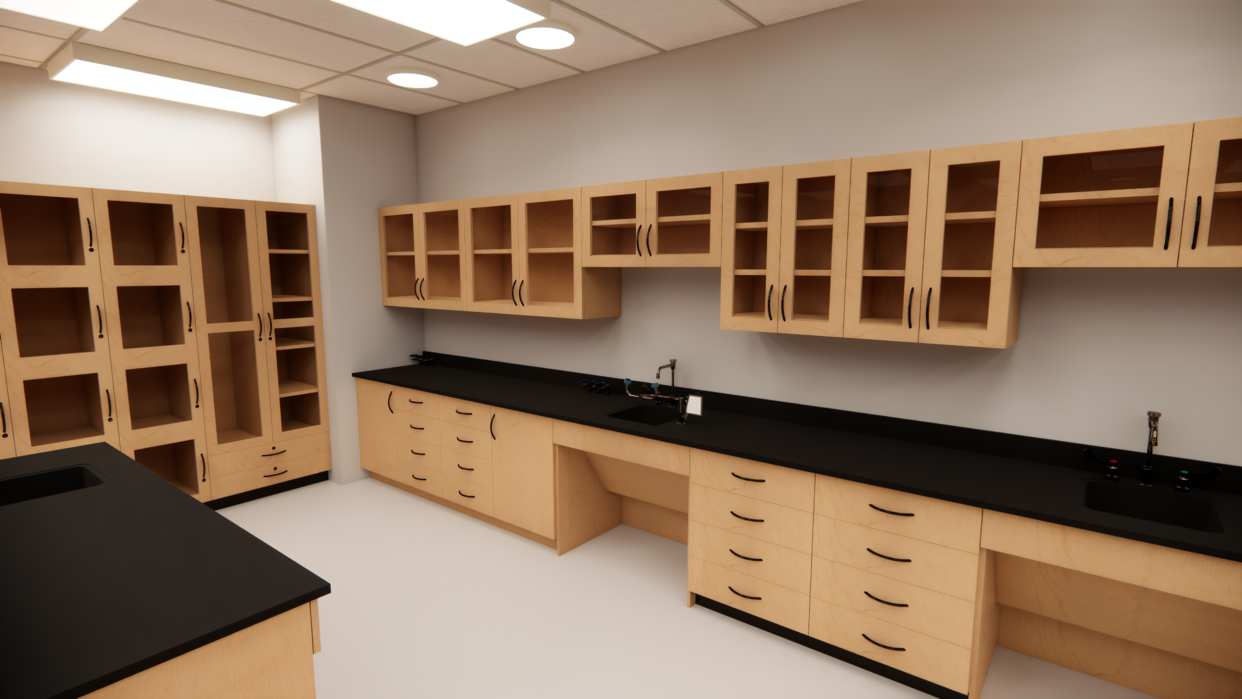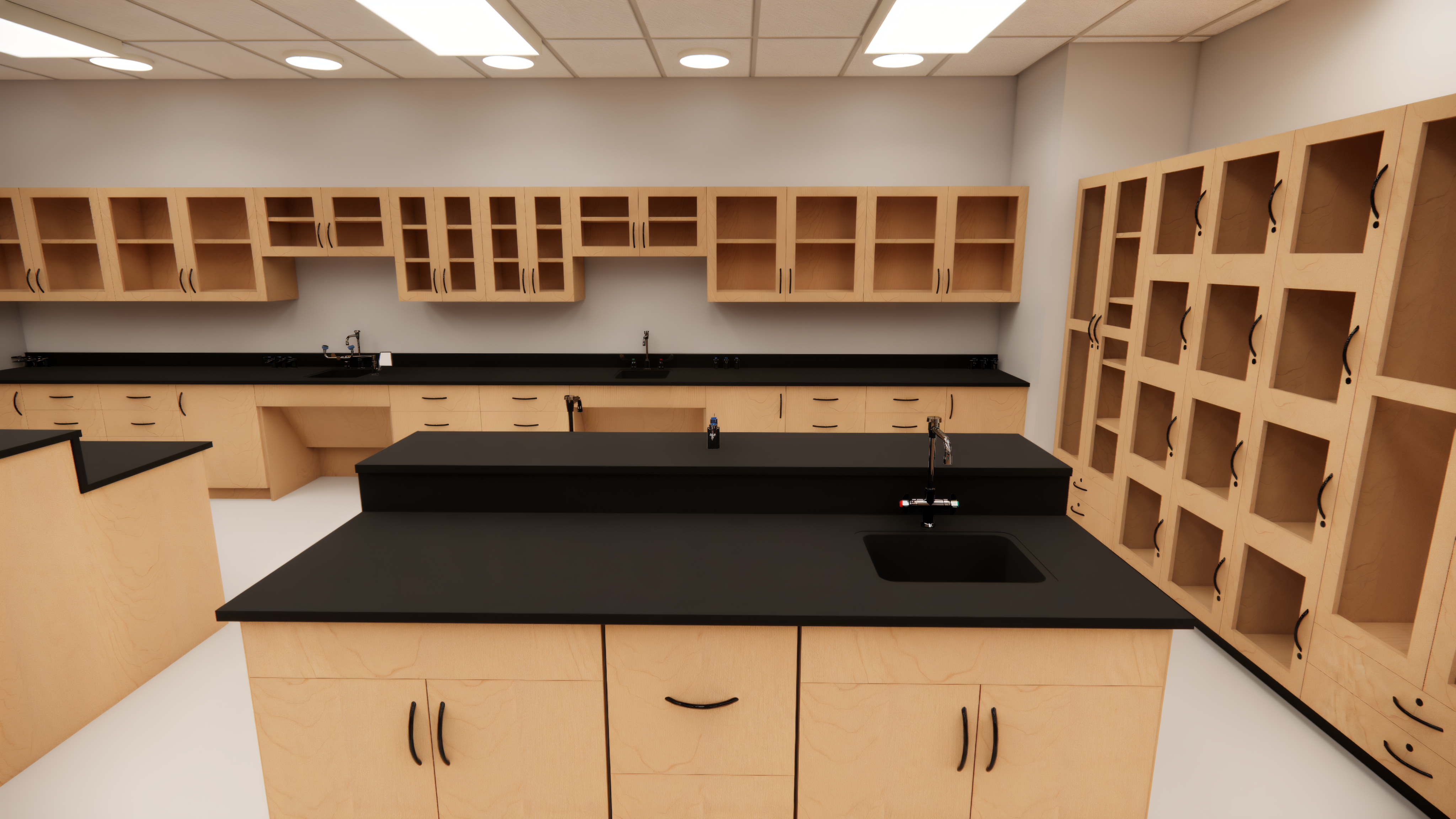- Safety Compliance: Integrated eyewash stations and emergency showers modeled for healthcare lab standards.
