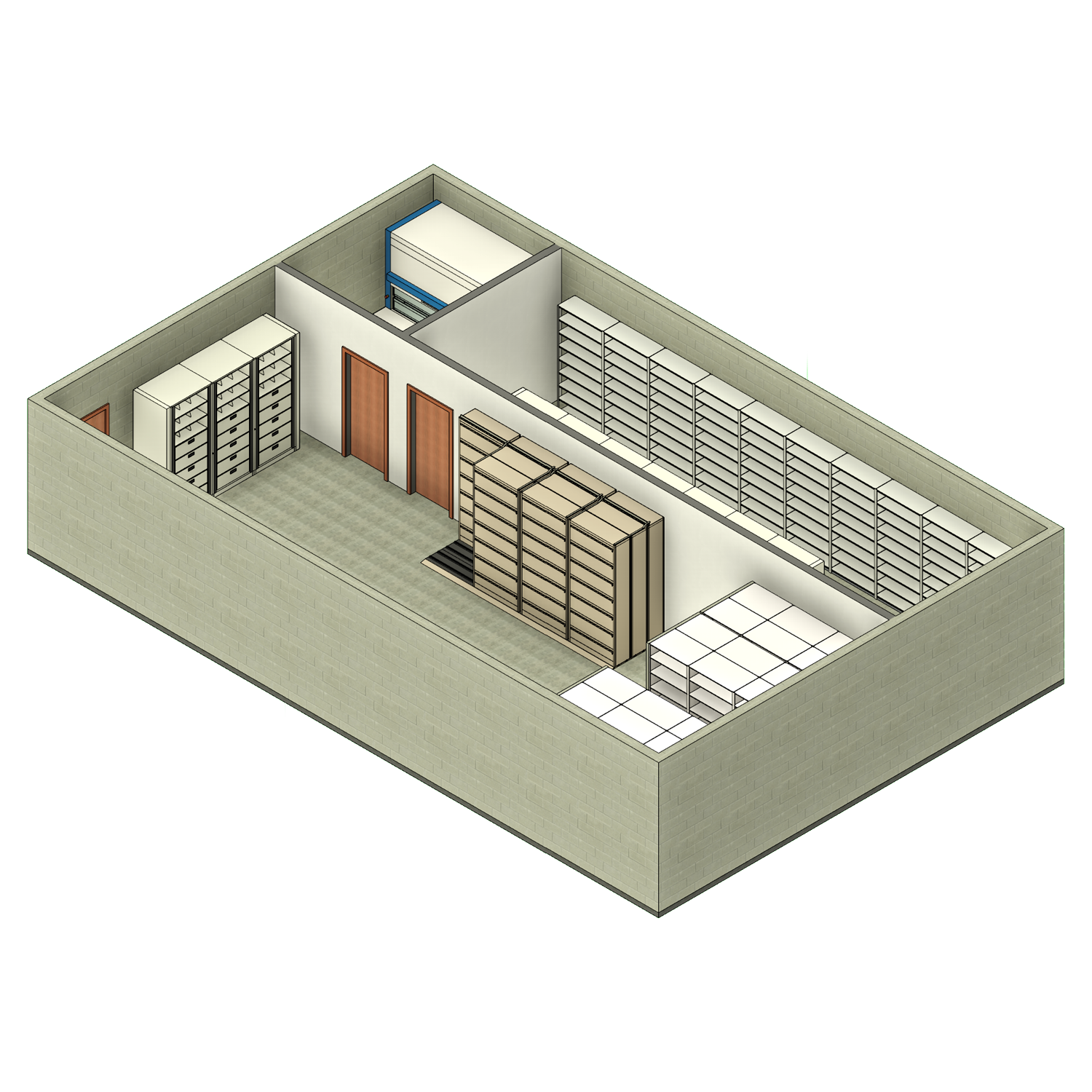 - BIM-ready Revit model with accurate Revit families for shelving, casework, and filing systems.