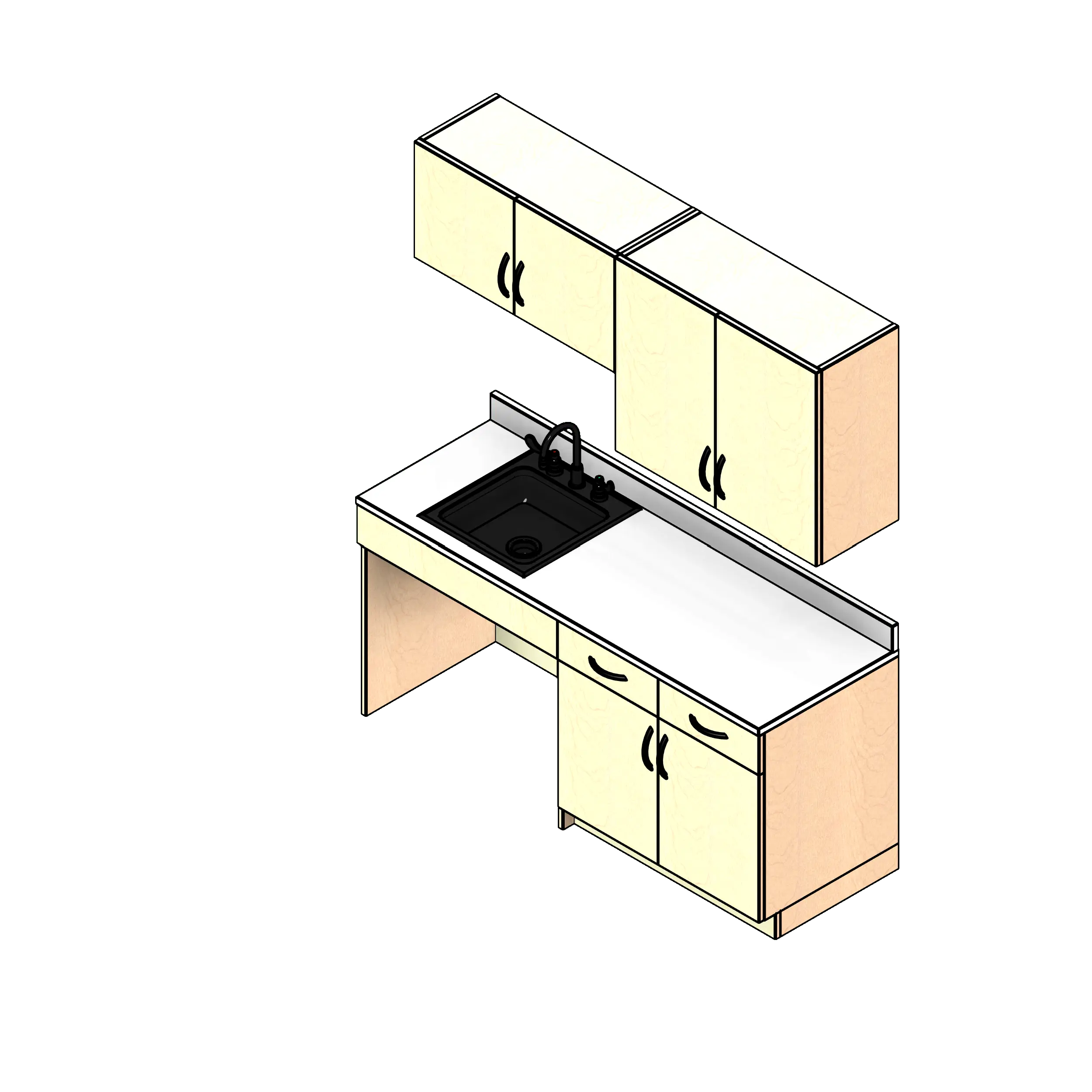 - Kit includes two base cabinets, two upper wall cabinets, one countertop with backsplash, and one sink with faucet.