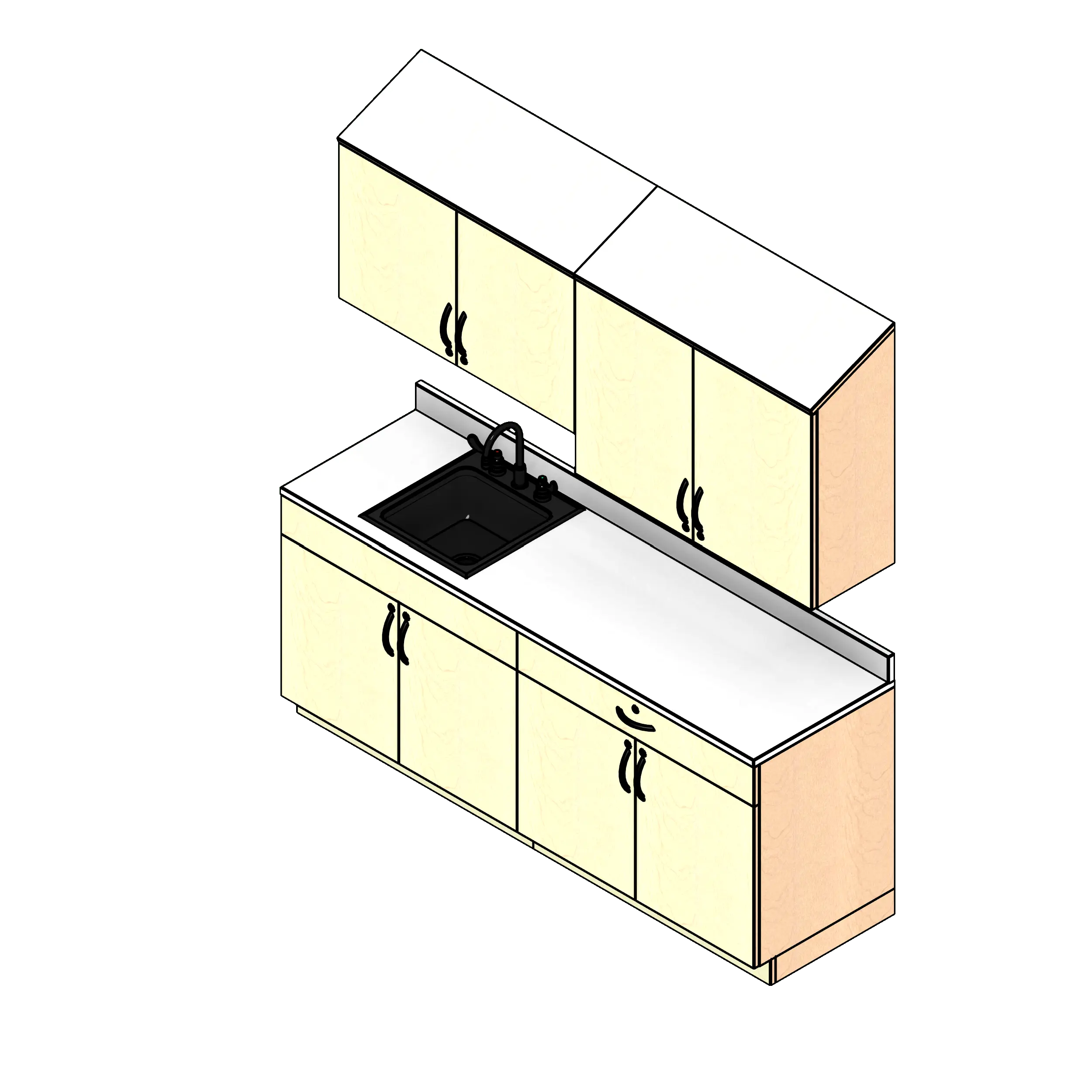 - Kit includes two base cabinets, two upper wall cabinets, one countertop with backsplash, and one sink with faucet.