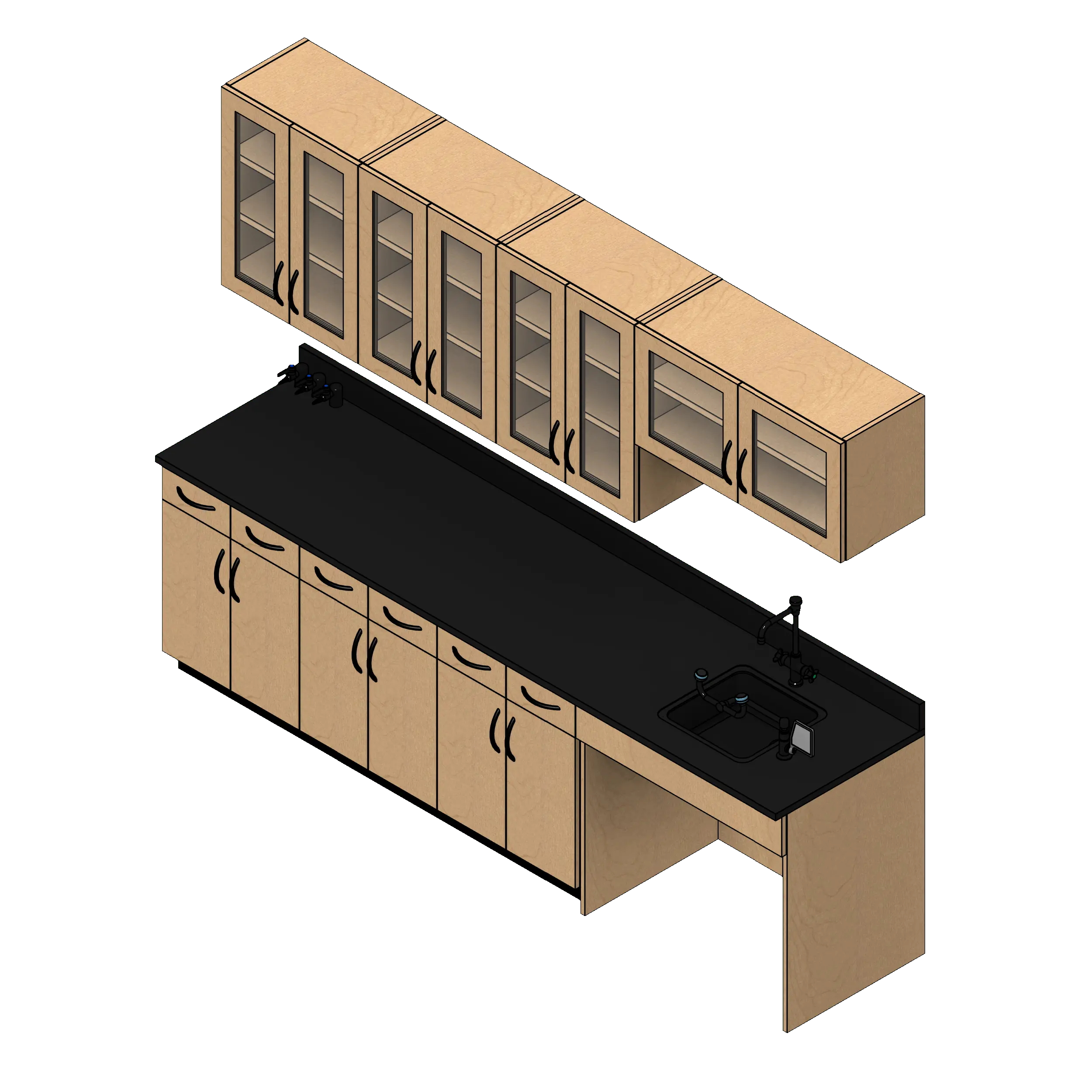 - Kit includes one ADA sink cabinet, three two drawer two door base cabinets, four two door wall cabinets, countertop with backsplash, one ADA sink with vacuum breaker faucet, one eye wash station, and three single head deck mounted gas valves.
