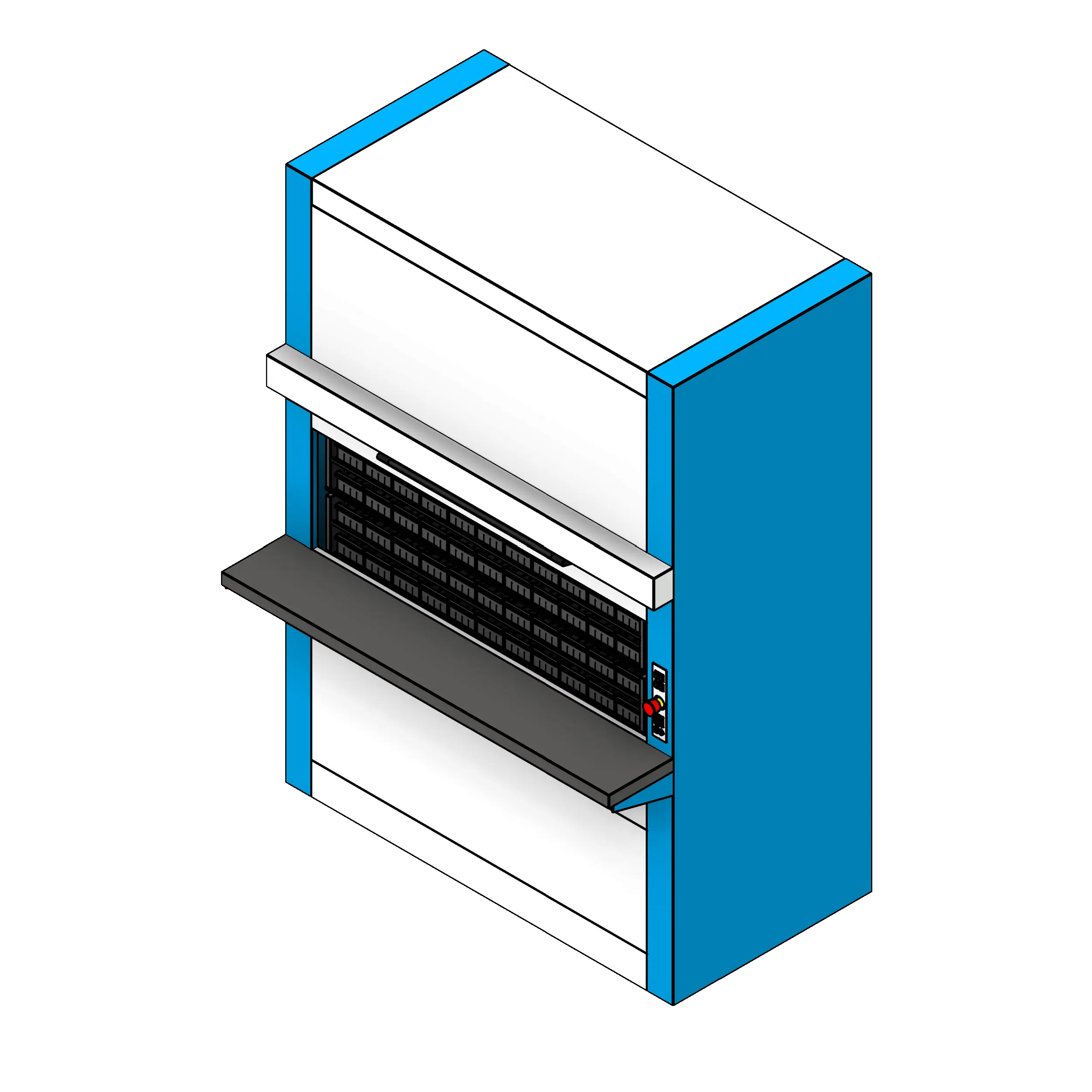 The Pathology Unit is designed to support the weight of the slide and tissue blocks inventory (0.28 lbs./LFI) while increasing slide density. Laboratories can save up to 75% floor space using the Pathology Unit over other standard pathology slide and tissue blocks storage methods. Pathology slides are stored in standard slide trays and placed in carriers within the Pathology Unit. When requested by an operator, the unit rotates around vertically and presents the slide tray to the operator eliminating walk and search time. Optionally, using light directed technology, position lights direct the operator to the location of each tray designed for slide or tissue block storage. Additional inventory management software can display other information about the slide or tissue block such as an identification number. This not only speeds up pick time, but also ensures the operator picks the correct slide or tissue block required. A Pathology Unit can increase productivity up to 2/3 over standard pathology slide and tissue block storage.