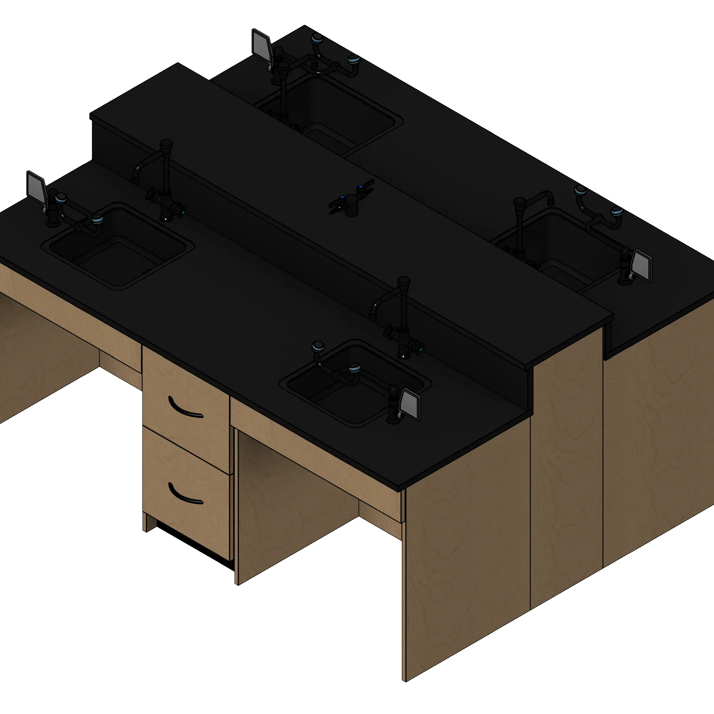 - Kit includes two ADA sink cabinets, two sink cabinets, two file file base cabinets, countertops, one quad head deck mounted gas valve, four sinks with vacuum breakers, and four eye wash stations.