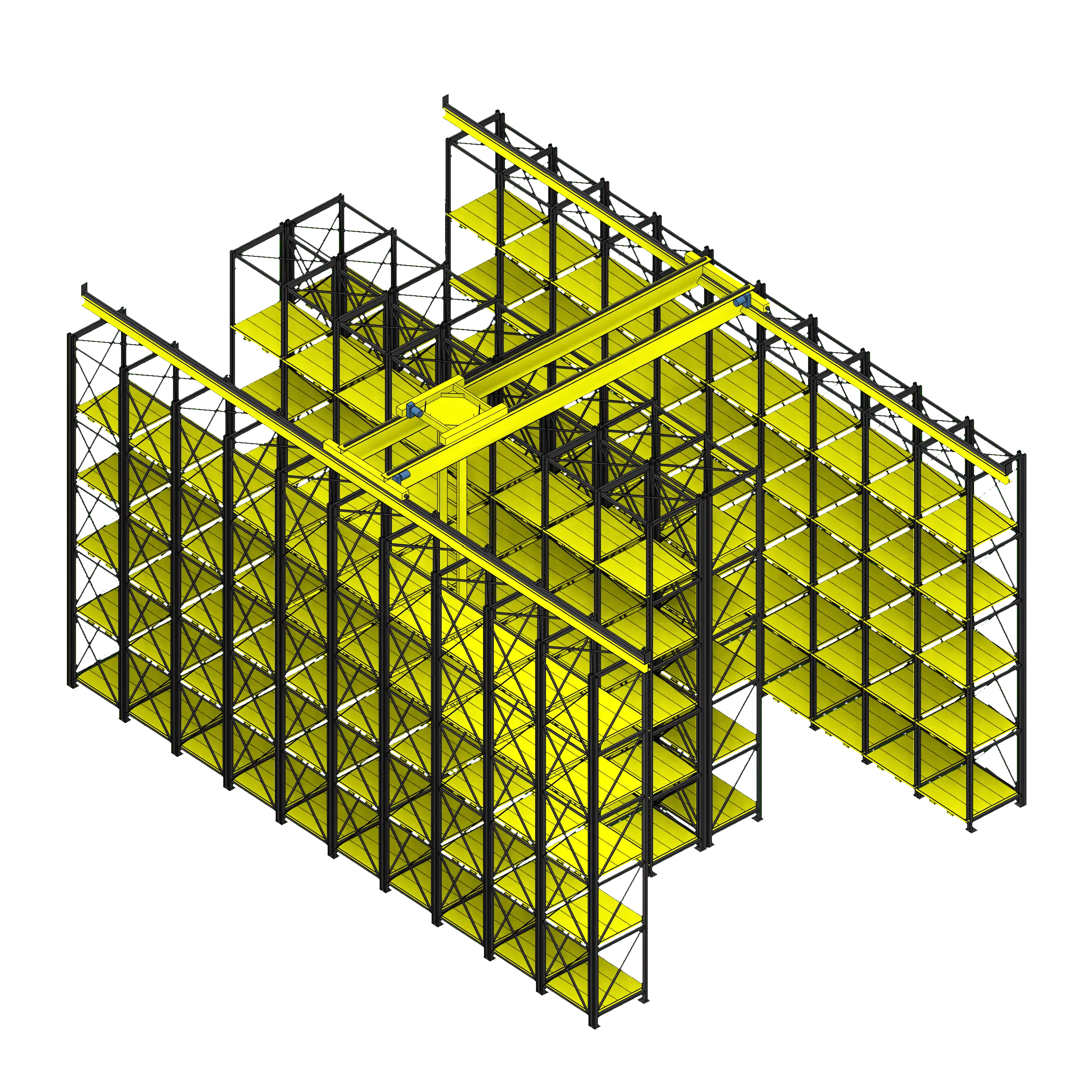 This ingenious storage system consists of instantly adjustable pallet racks and a robust gantry crane. The pallet racks work with special steel pallets that slot directly into the rack using tabs on the back of the pallet and the pins in the frame upright; this allows for pallets to be stacked as tightly as possible without wasted air space above or below traditional fixed beam pallet racks. The pallets may be instantly repositioned using the full-length forklift pockets on the bottom of each pallet.
