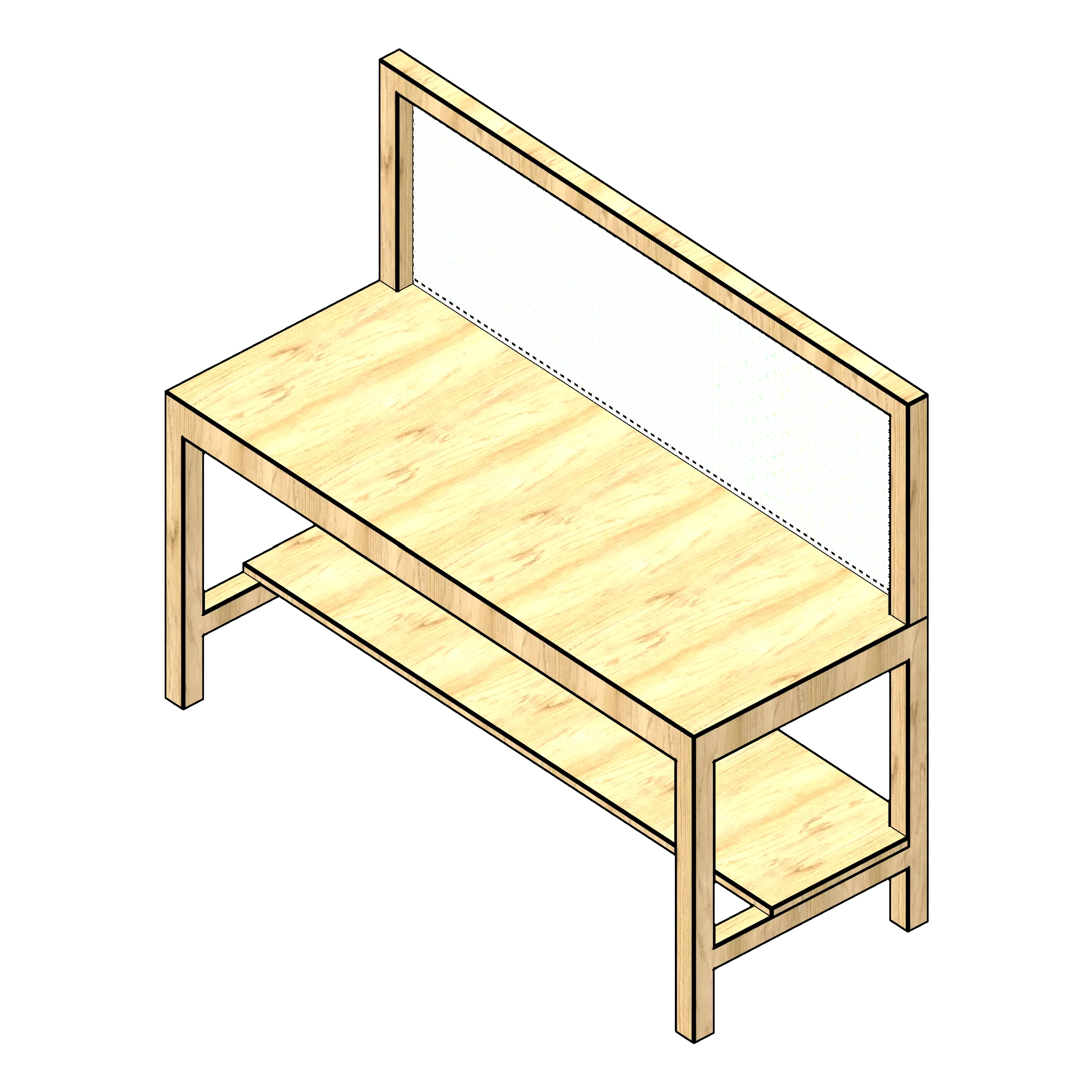 This generic workbench provides a strong space to work, especially with tools. It is used by home carpenters and mechanics to do manual work. It also features a peg board to hold and hang working equipment.