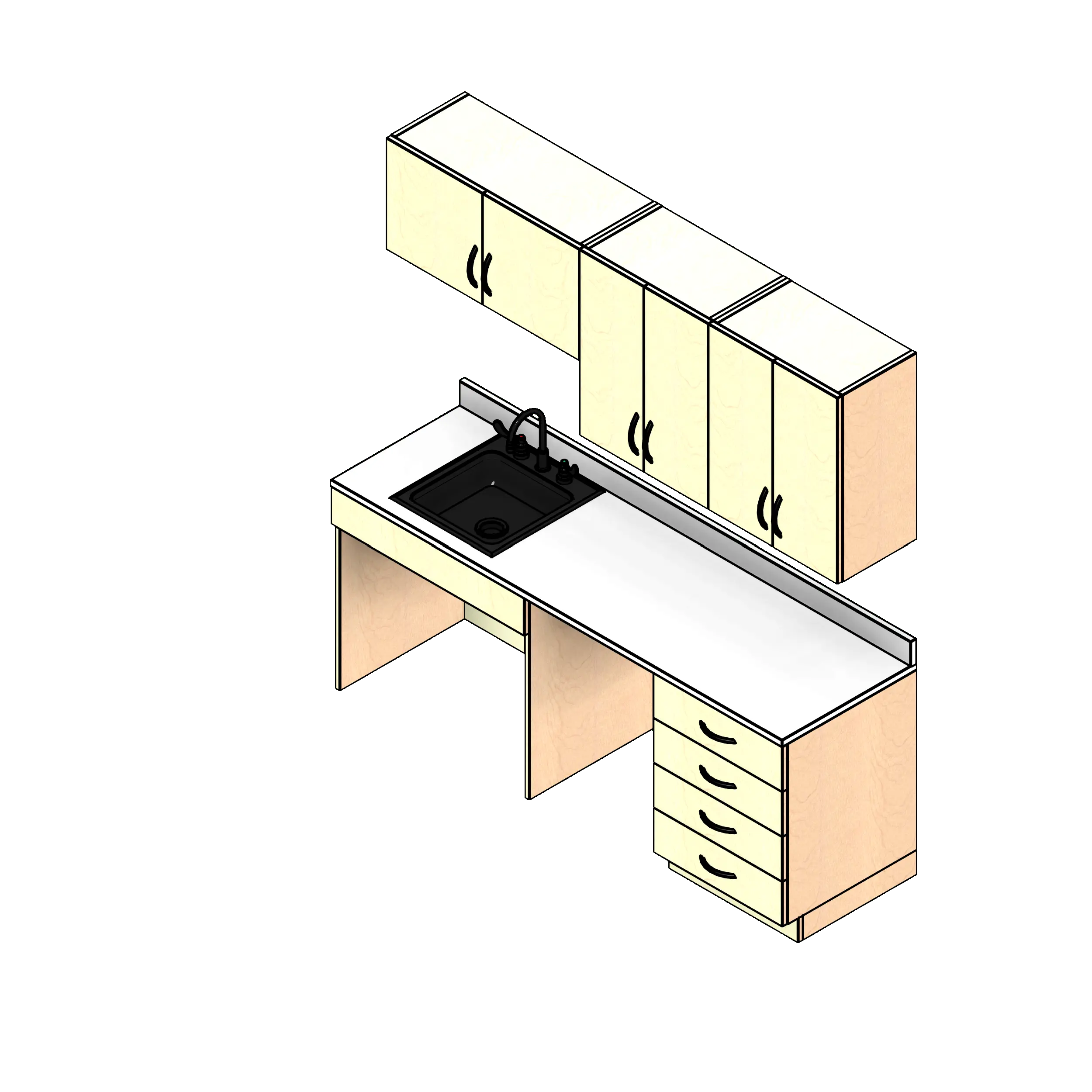 - Kit includes two base cabinets, three upper wall cabinets, one countertop with backsplash, and one sink with faucet.