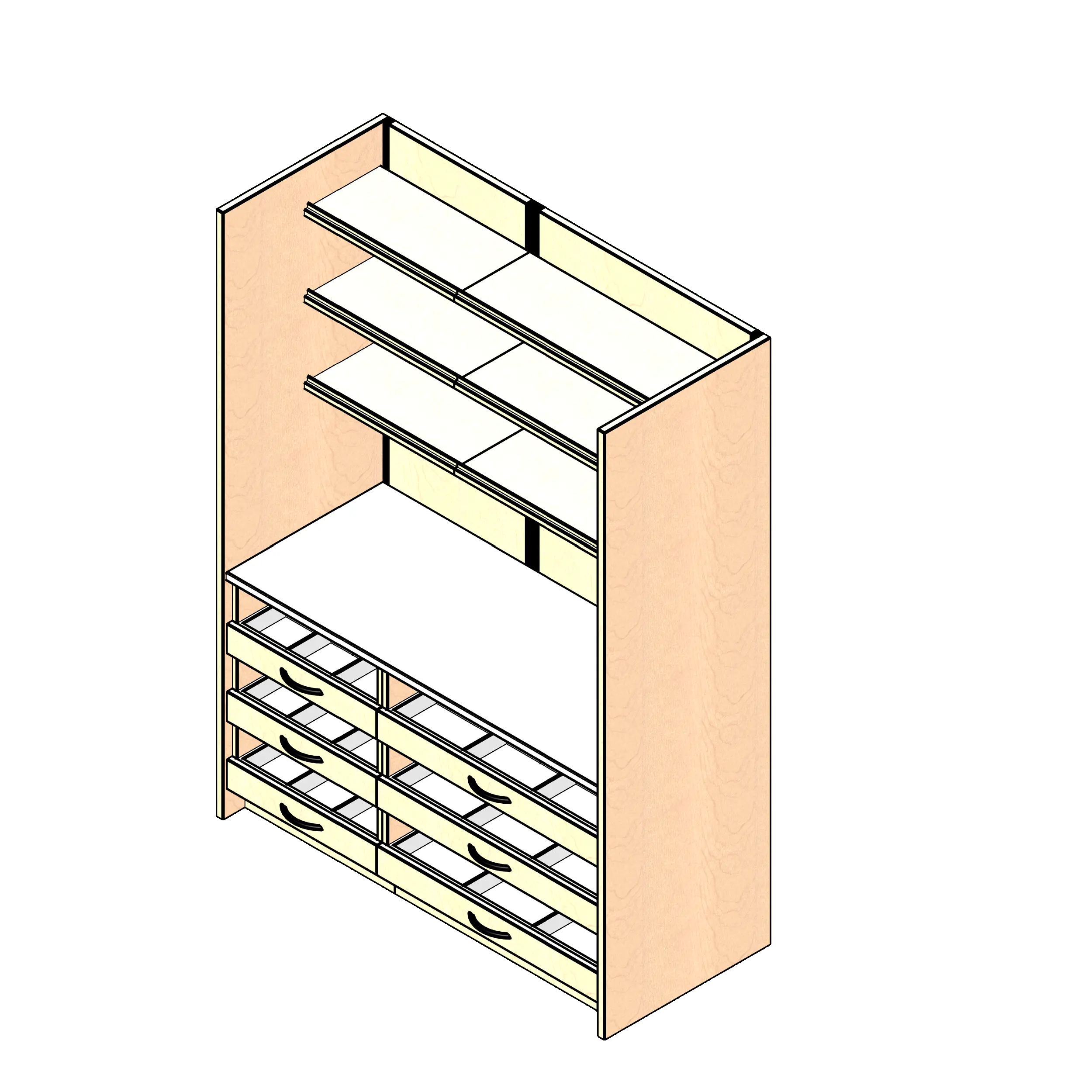 - Kit includes two tray drawer base cabinets, one countertop, six adjustable shelves, two back panels, and two side panels.