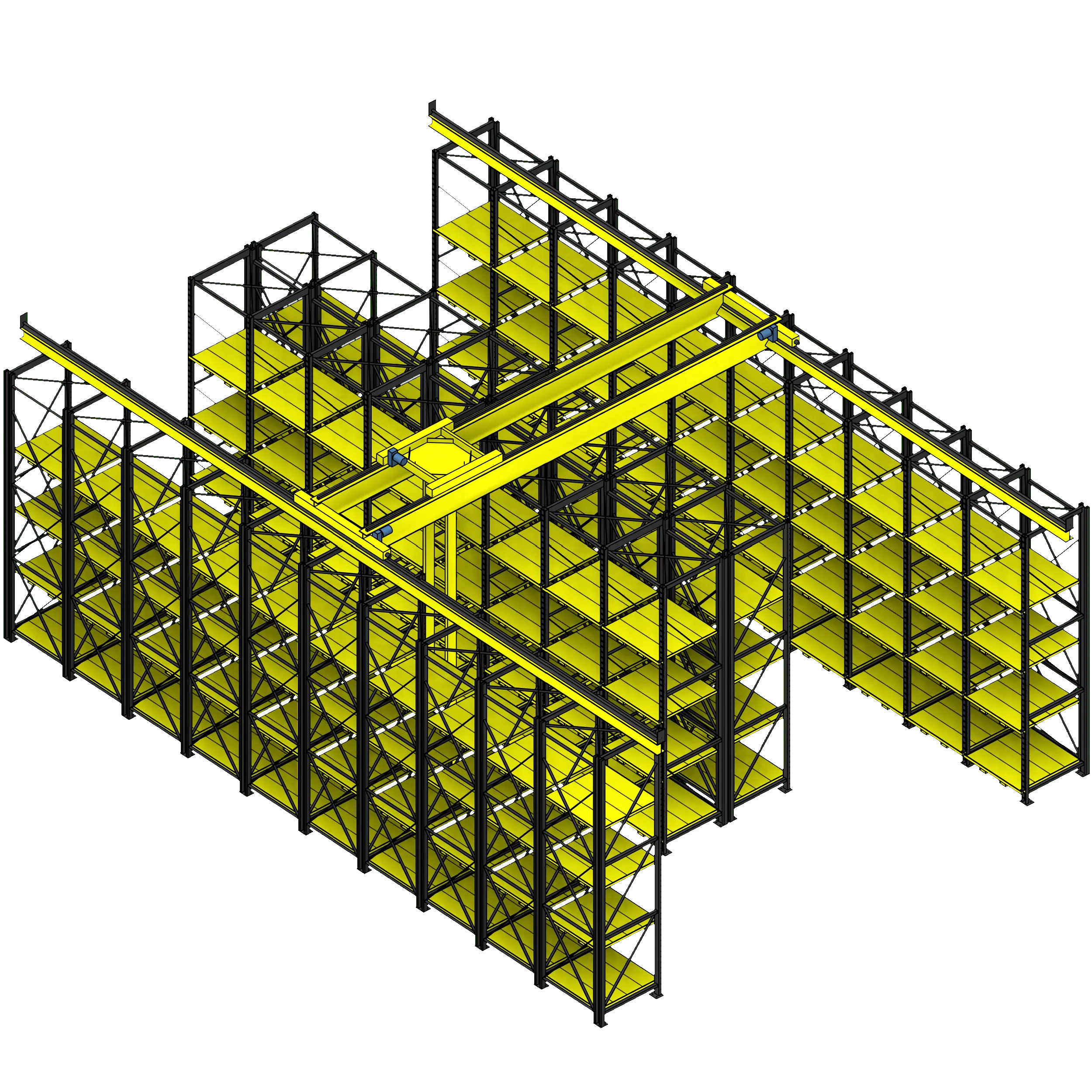 This ingenious storage system consists of instantly adjustable pallet racks and a robust gantry crane. The pallet racks work with special steel pallets that slot directly into the rack using tabs on the back of the pallet and the pins in the frame upright; this allows for pallets to be stacked as tightly as possible without wasted air space above or below traditional fixed beam pallet racks. The pallets may be instantly repositioned using the full-length forklift pockets on the bottom of each pallet.