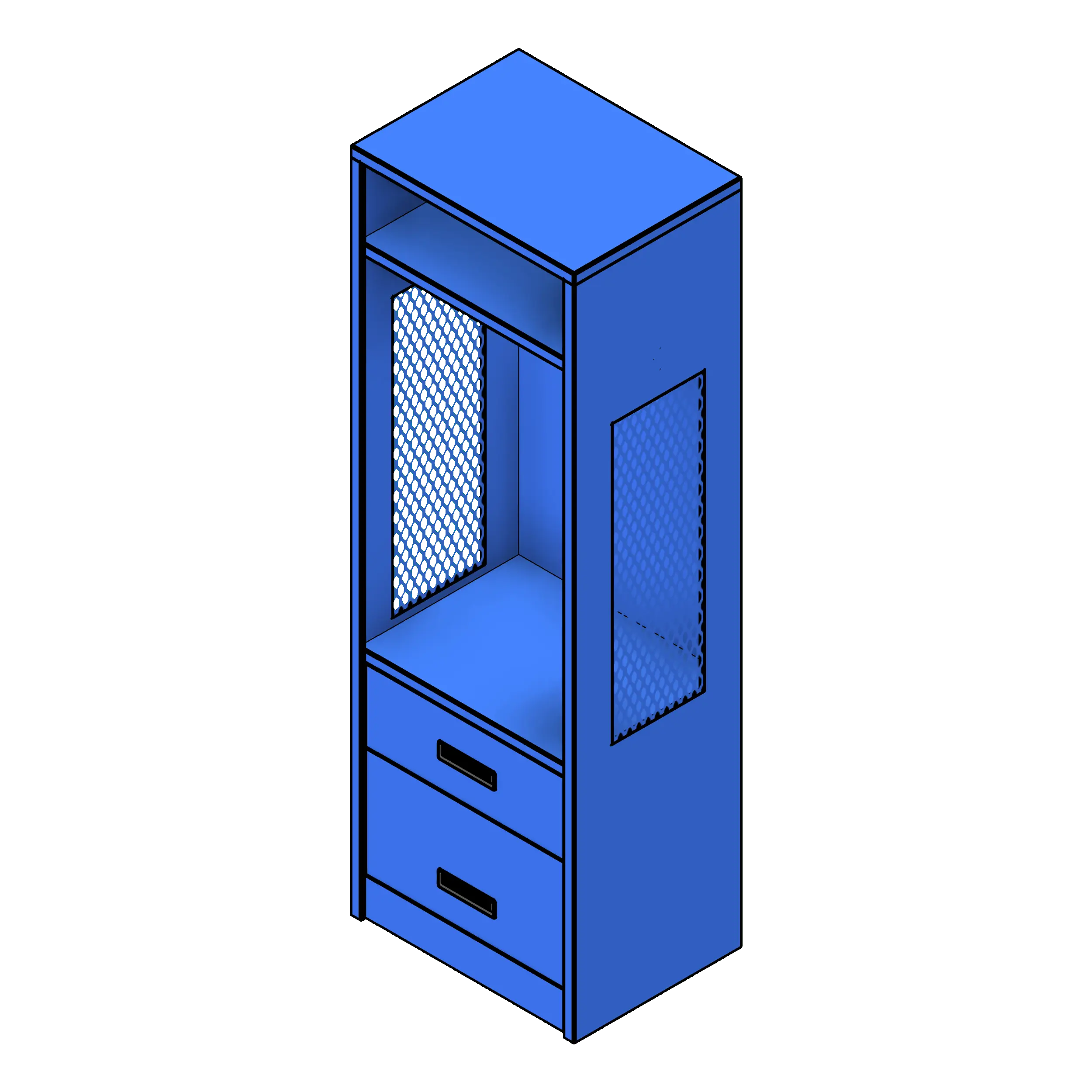 To use this family, simply load it from the Fetch app into your project. Select between 18" and 24" depth using the check boxes in the Dimensions category. Options for a door, top cabinet, drawers, foot locker, and raised legs, can be found in the construction category.