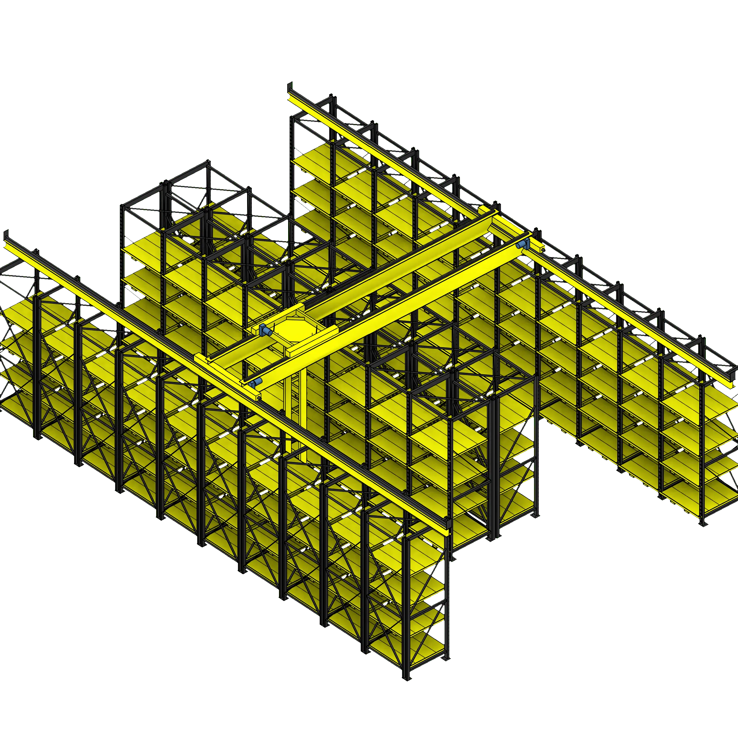 This ingenious storage system consists of instantly adjustable pallet racks and a robust gantry crane. The pallet racks work with special steel pallets that slot directly into the rack using tabs on the back of the pallet and the pins in the frame upright; this allows for pallets to be stacked as tightly as possible without wasted air space above or below traditional fixed beam pallet racks. The pallets may be instantly repositioned using the full-length forklift pockets on the bottom of each pallet.