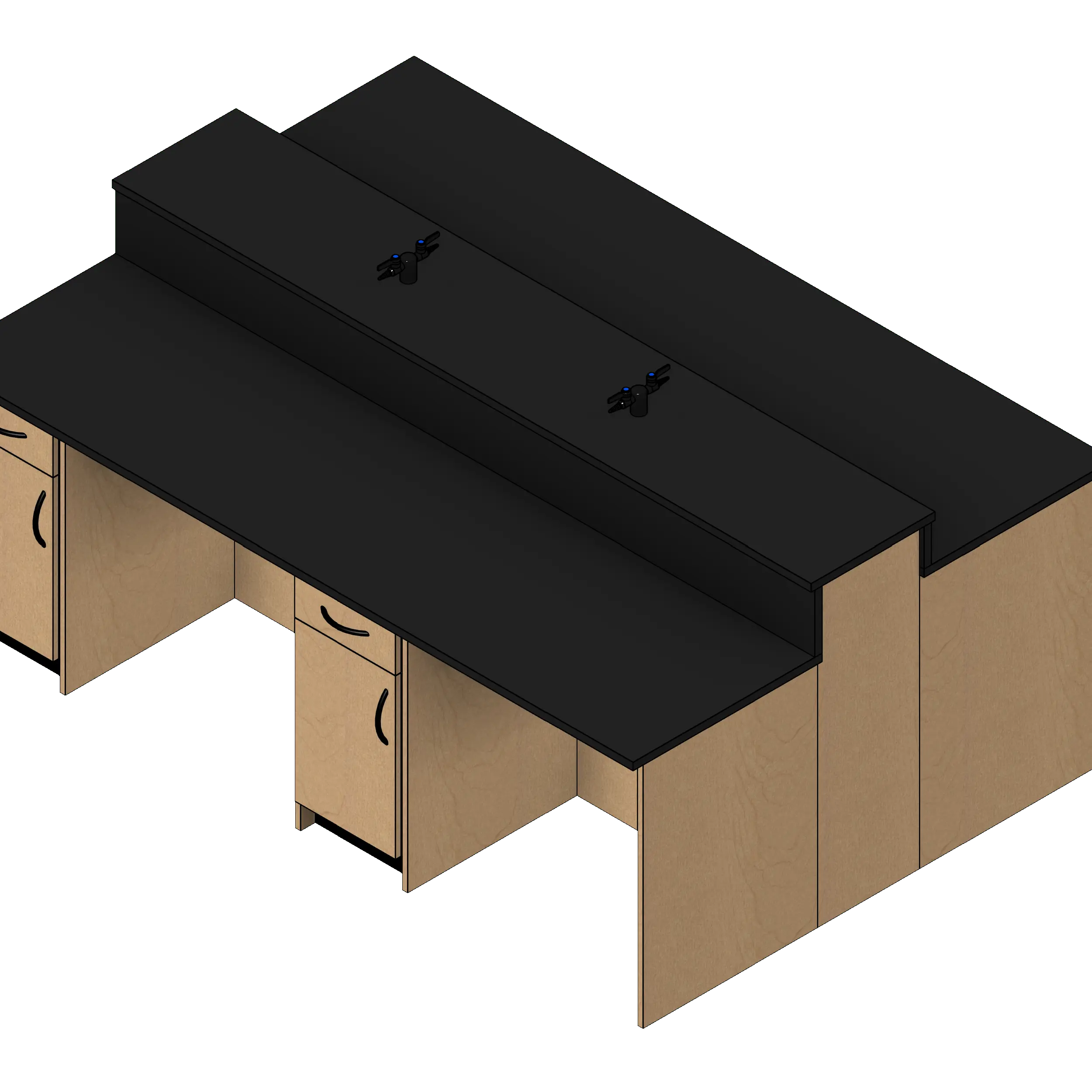 - Kit includes four open knee space base cabinets, four one drawer one door base cabinets, countertop with backsplashes, and two dual head deck mounted gas valves.