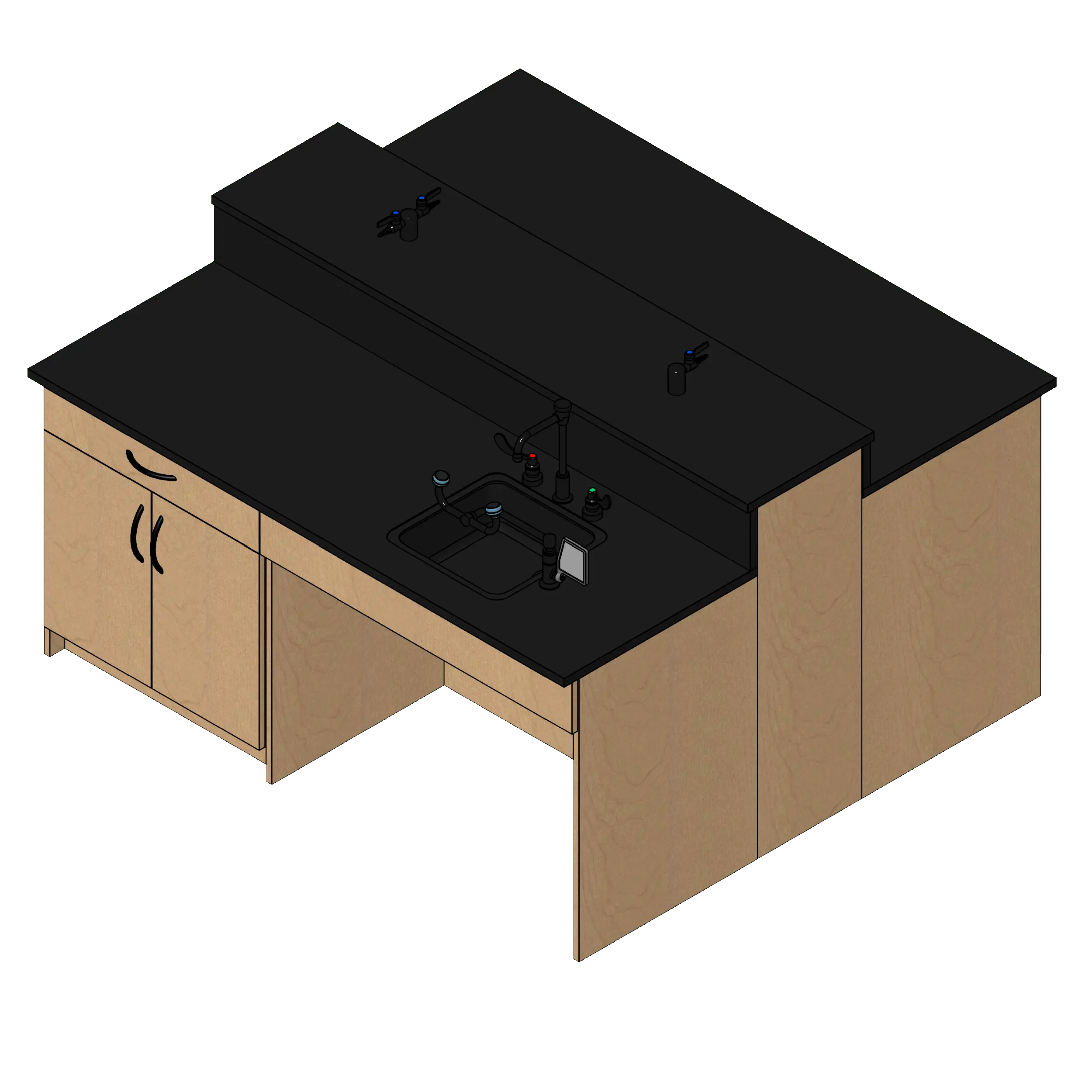 - Kit includes one ADA sink cabinet, one one drawer two door base cabinet, two open knee space cabinets, two one drawer one door base cabinets, countertops with backsplashes, one ADA sink with vacuum breaker faucet, one eye wash station, one dual head deck mounted gas valve, and one single head deck mounted gas valve.