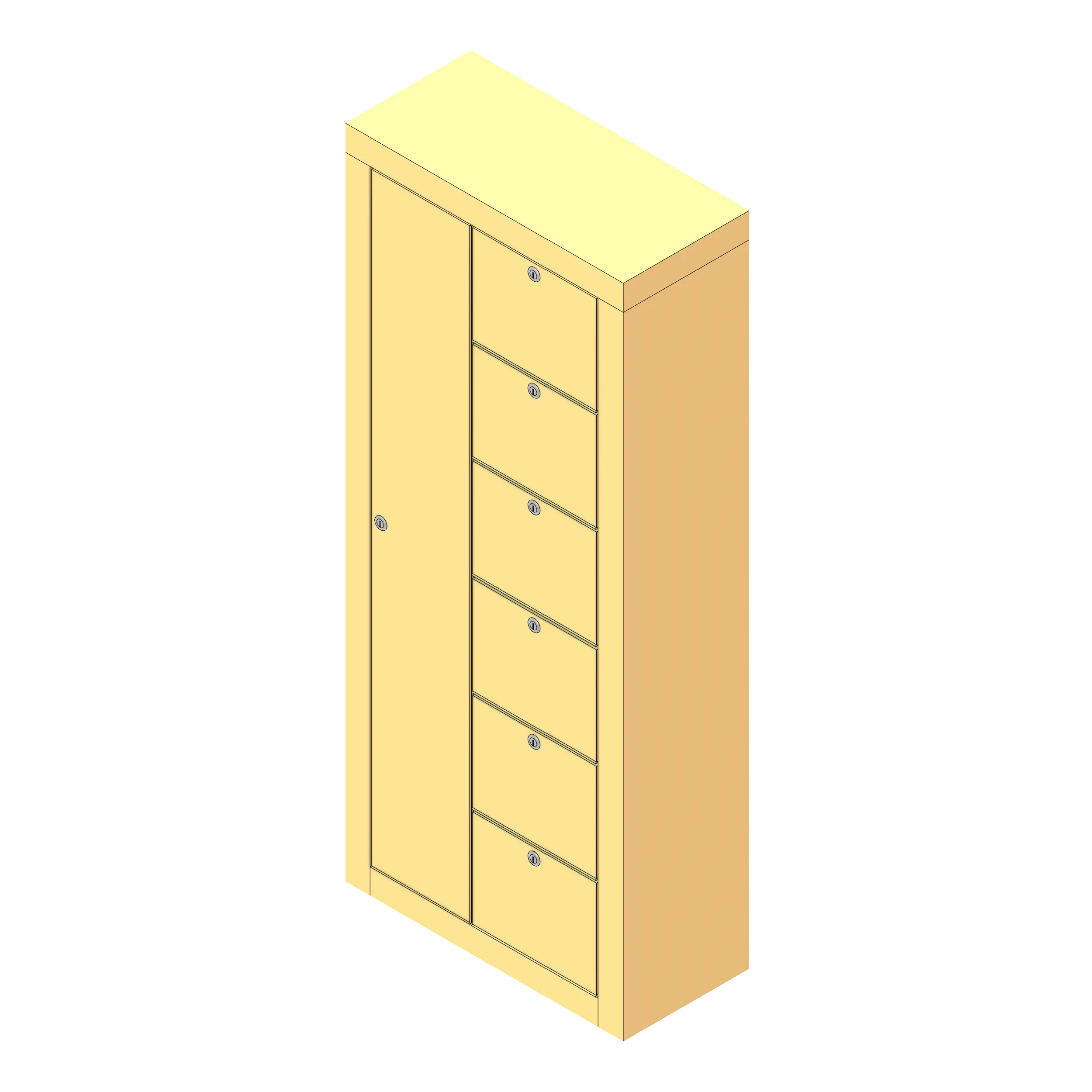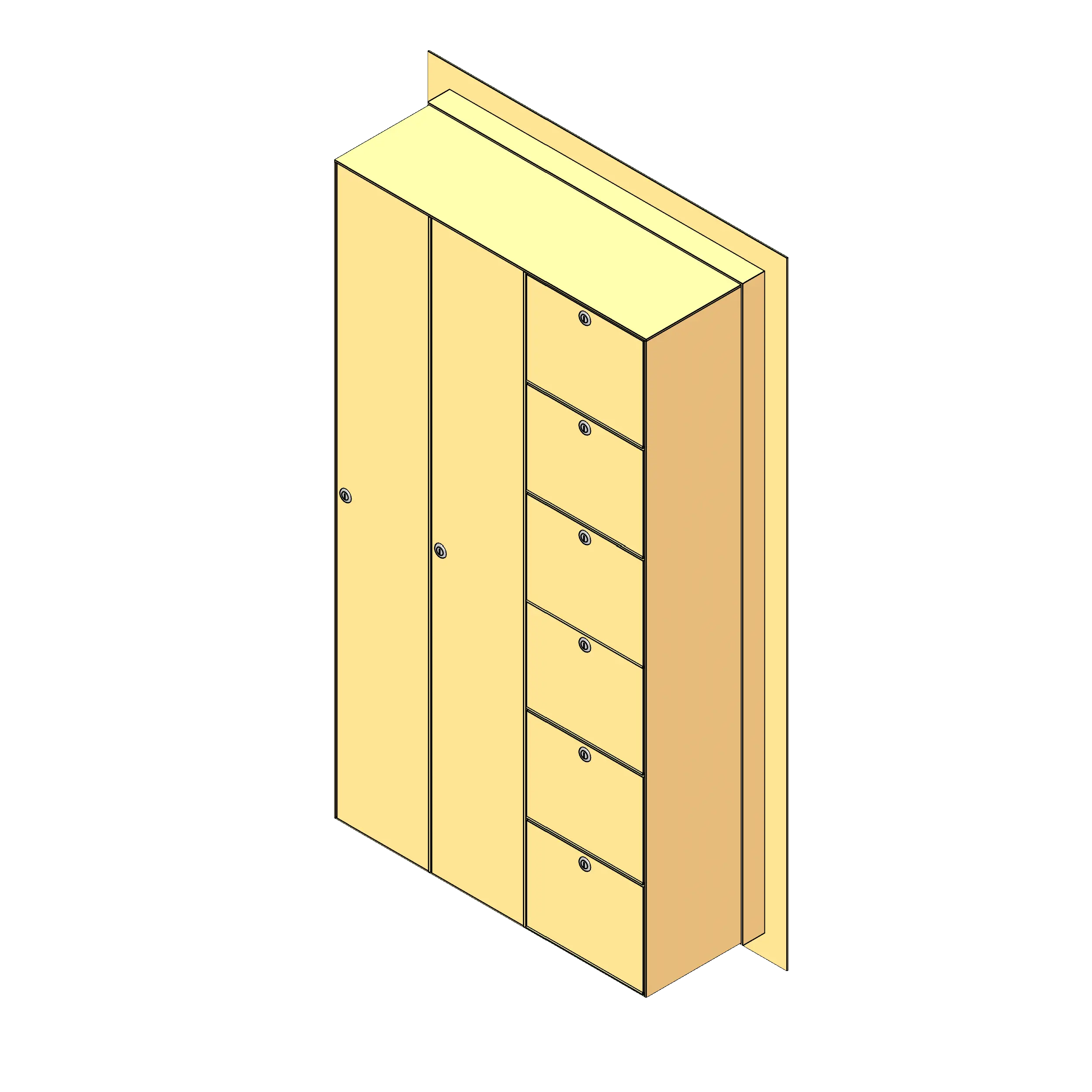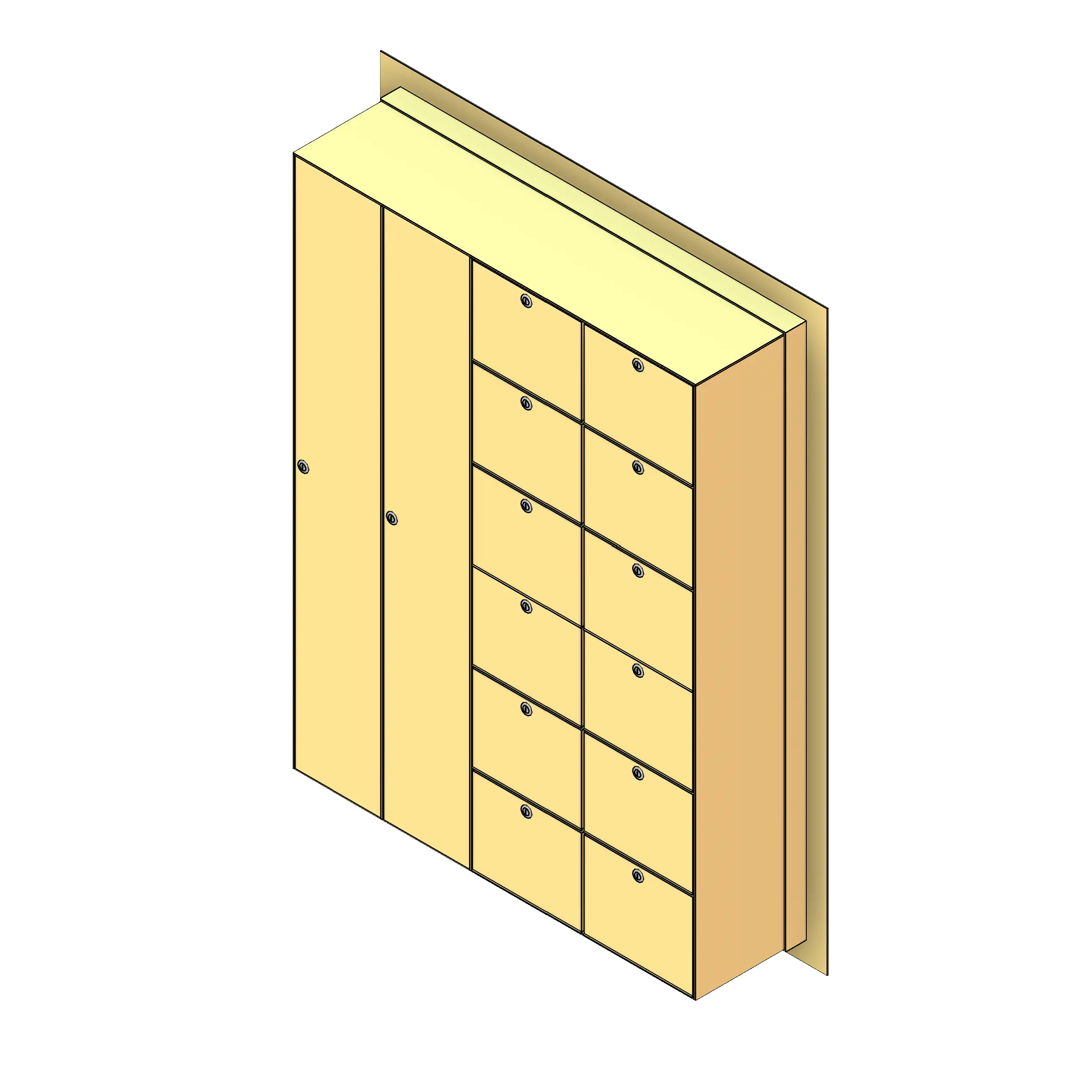 To use this family, insert it into your project from the Fetch app and click on a wall or surface to apply the locker. Select the desired door configuration from the type drop-down and use the parameters in the properties browser to choose between surface and recessed mounting options. The optional master door may also be applied using the checkbox.