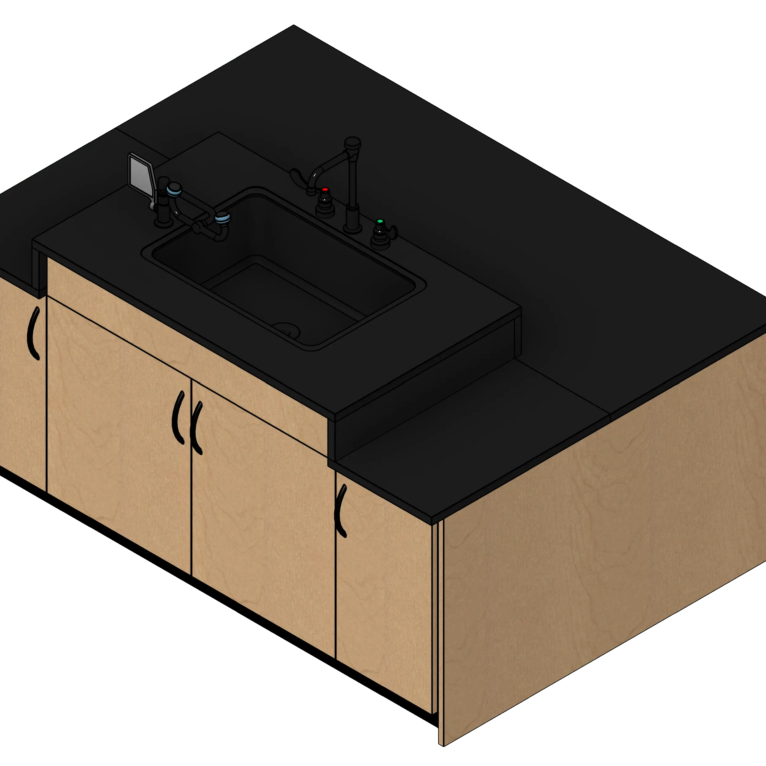 - Kit includes one sink base cabinet, two one door base cabinets, two open knee space cabinets, countertops with backsplashes, one sink with vacuum breaker faucet, and one eye wash station.