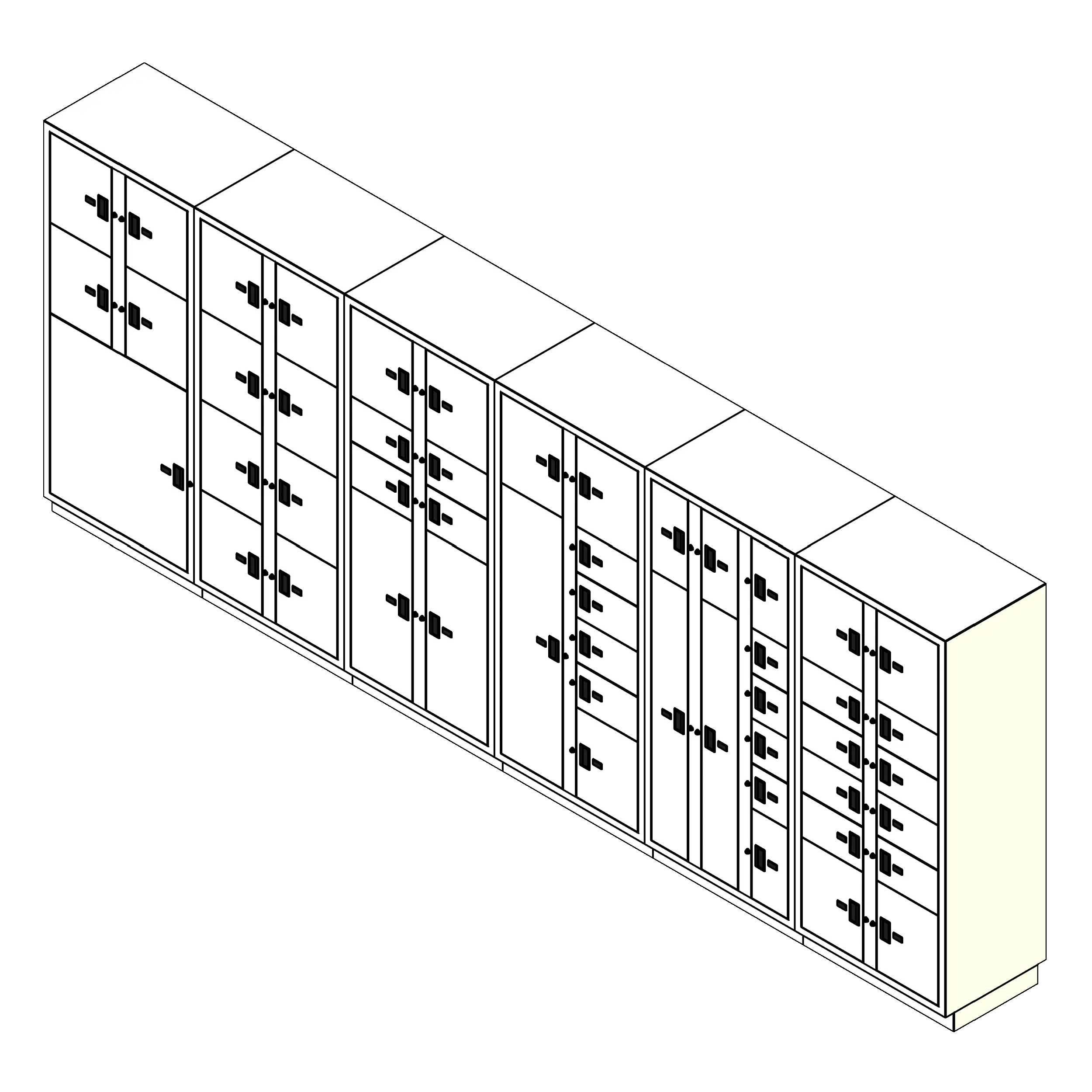 These lockers are used in public safety departments to ensure the integrity of evidence until it can be accessed by authorized personnel. This preconfigured group contains a total of 51 doors with pass-back capabilities.