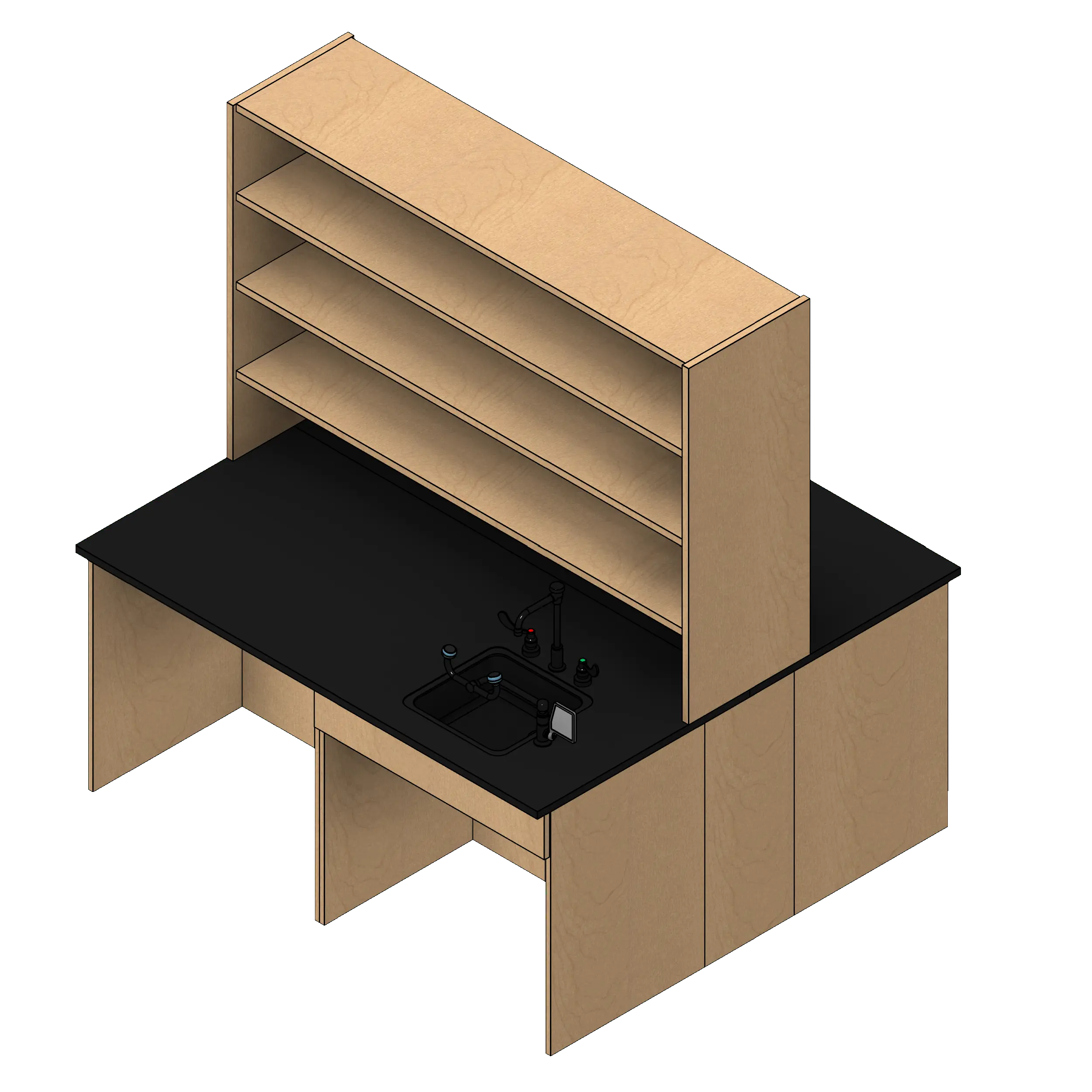 - Kit includes one ADA sink cabinet, three open knee space cabinets, two one drawer one door base cabinets, one ADA sink with vacuum breaker faucet, one eye wash station, countertop, and one bulk sorter.