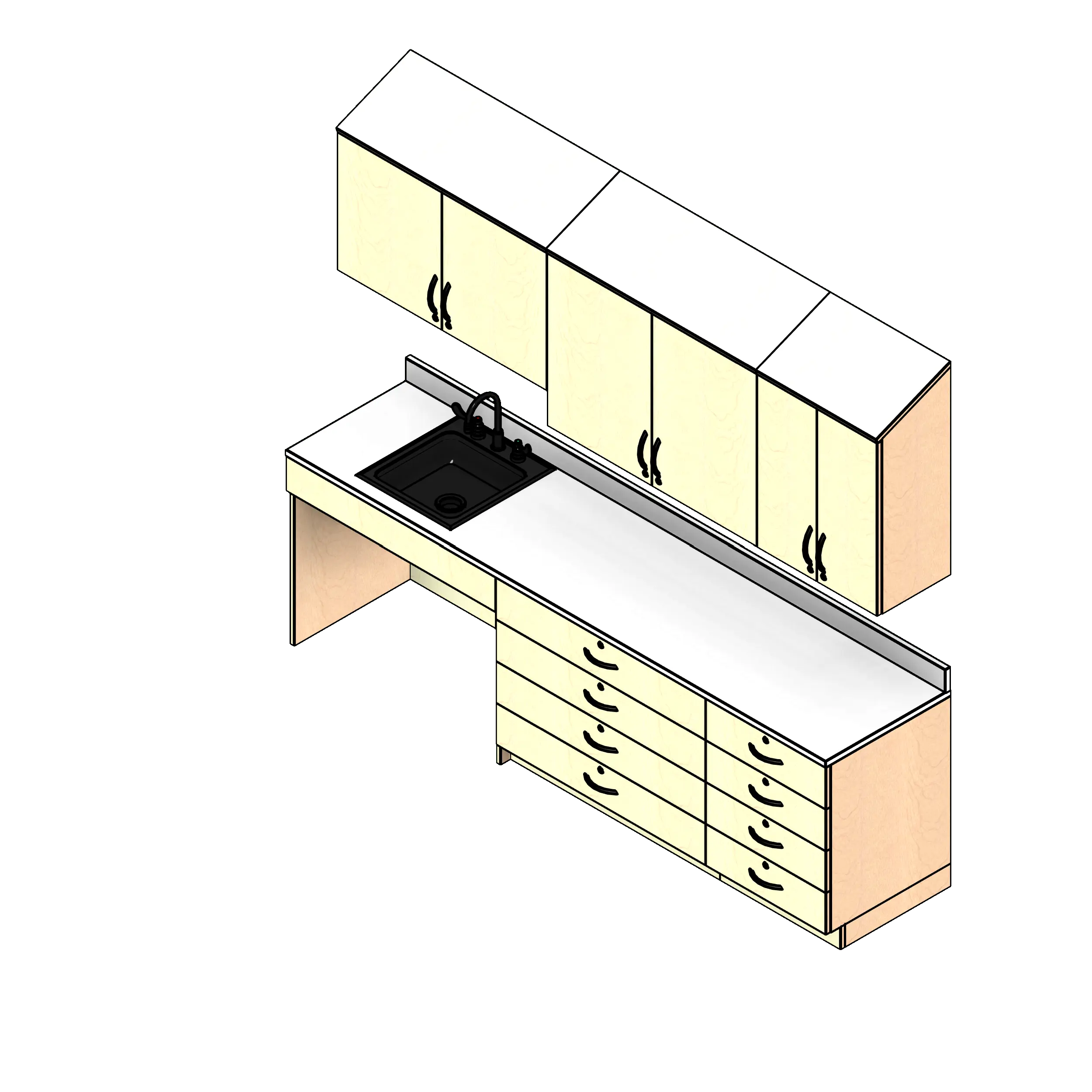 - Kit includes three base cabinets, three upper wall cabinets, one countertop with backsplash, and one sink with faucet.