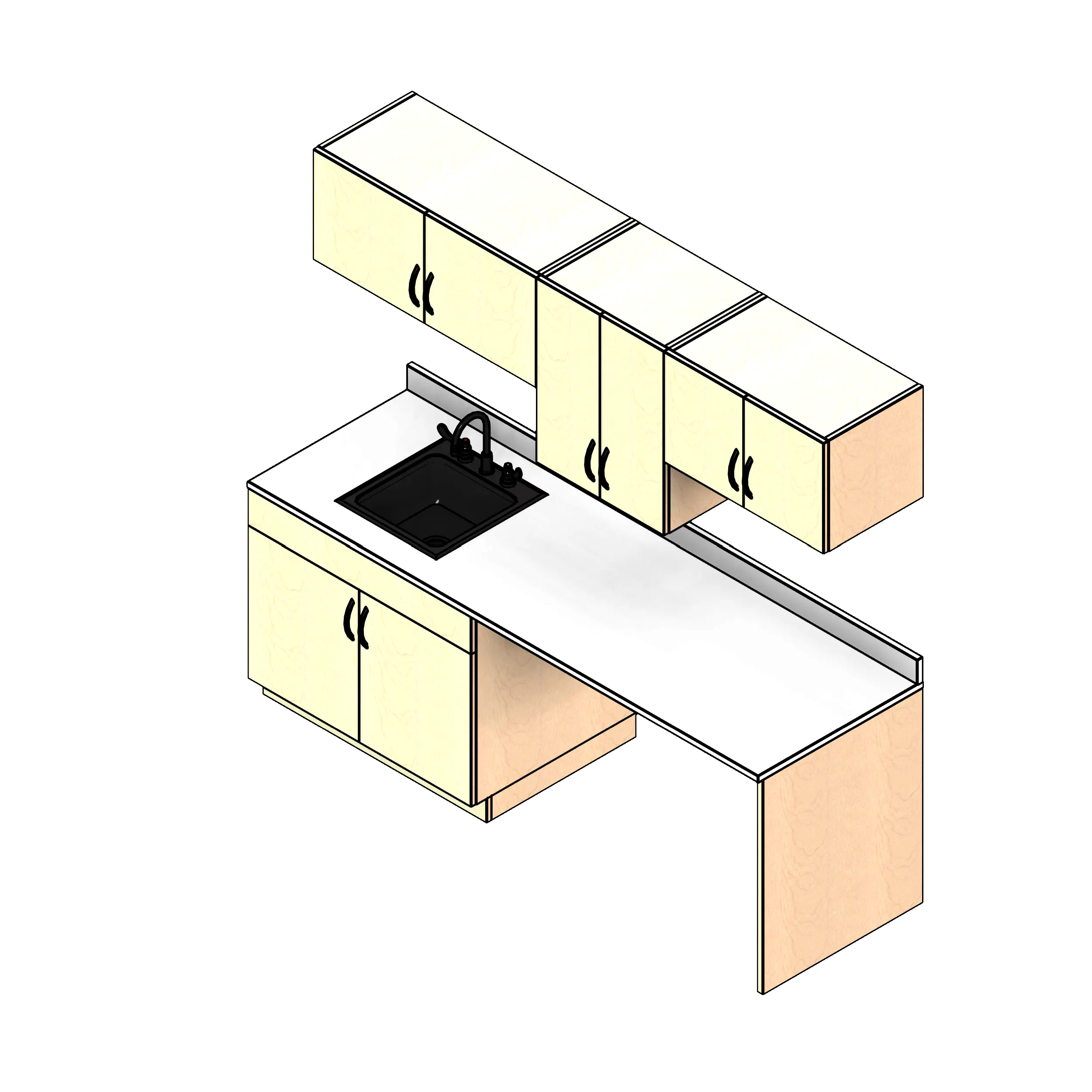 - Kit includes one base cabinet, three upper wall cabinets, one countertop with backsplash, and one sink with faucet.