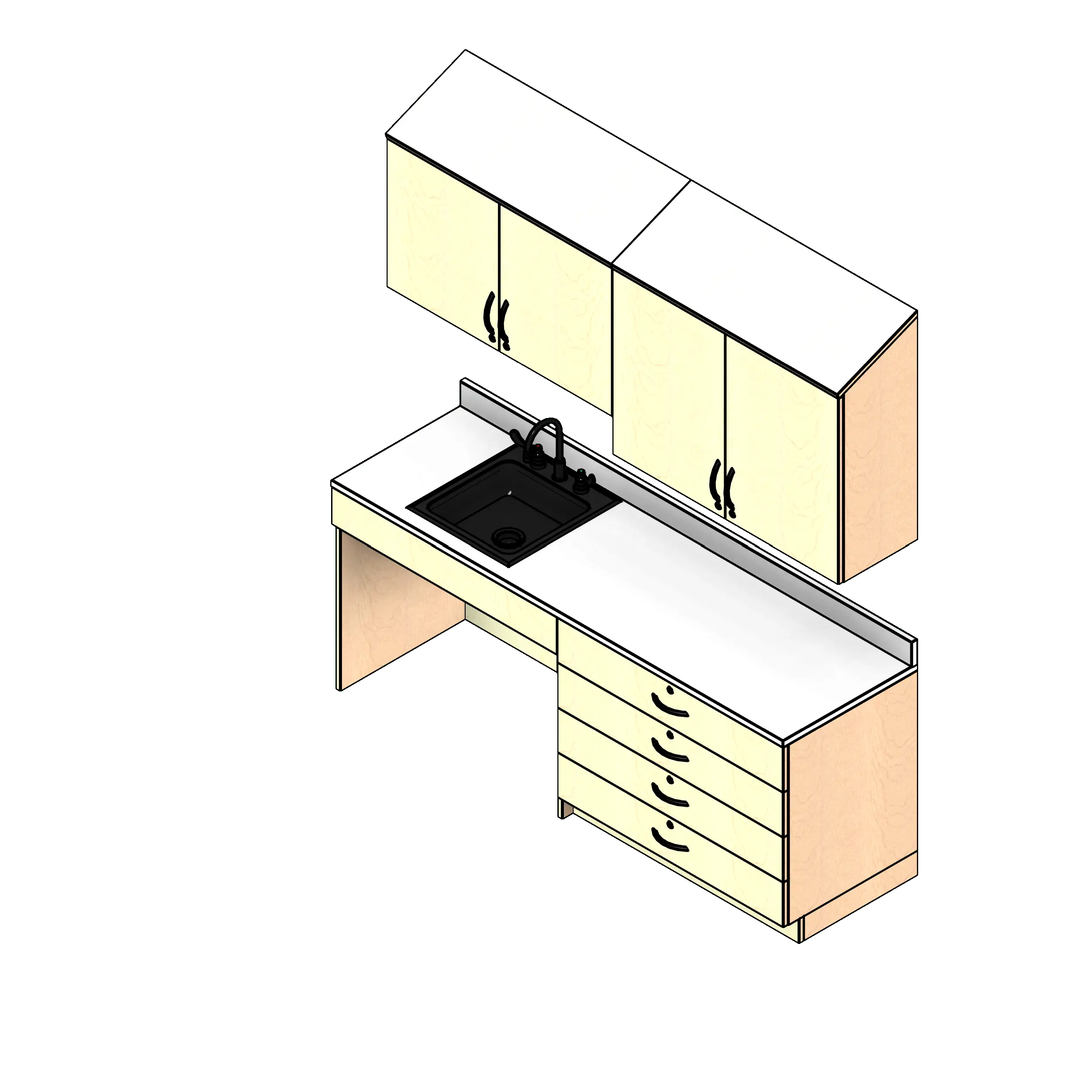 - Kit includes two base cabinets, two upper wall cabinets, one countertop with backsplash, and one sink with faucet.