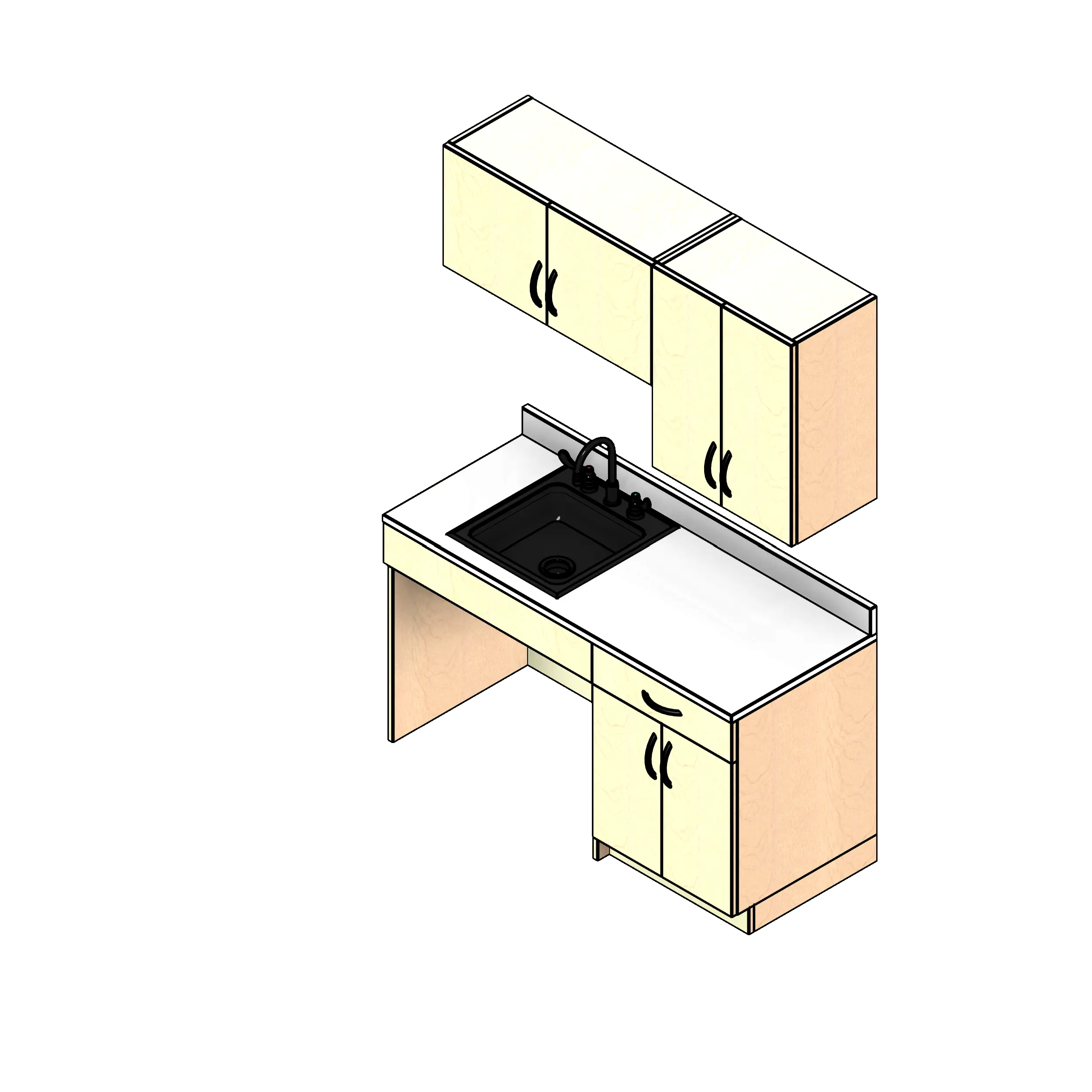 - Kit includes two base cabinets, two upper wall cabinets, one countertop with backsplash, and one sink with faucet.