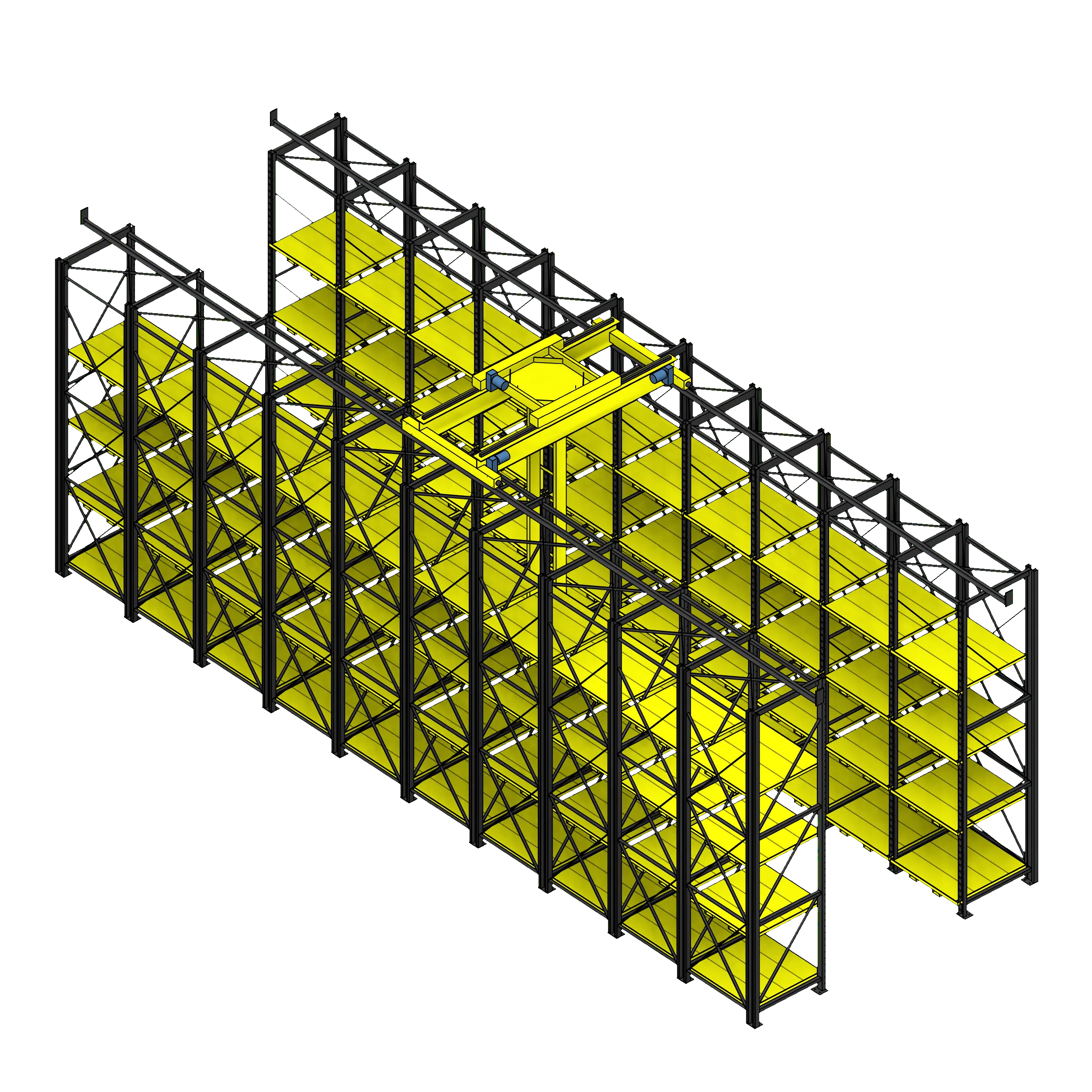 This ingenious storage system consists of instantly adjustable pallet racks and a robust gantry crane. The pallet racks work with special steel pallets that slot directly into the rack using tabs on the back of the pallet and the pins in the frame upright; this allows for pallets to be stacked as tightly as possible without wasted air space above or below traditional fixed beam pallet racks. The pallets may be instantly repositioned using the full-length forklift pockets on the bottom of each pallet.