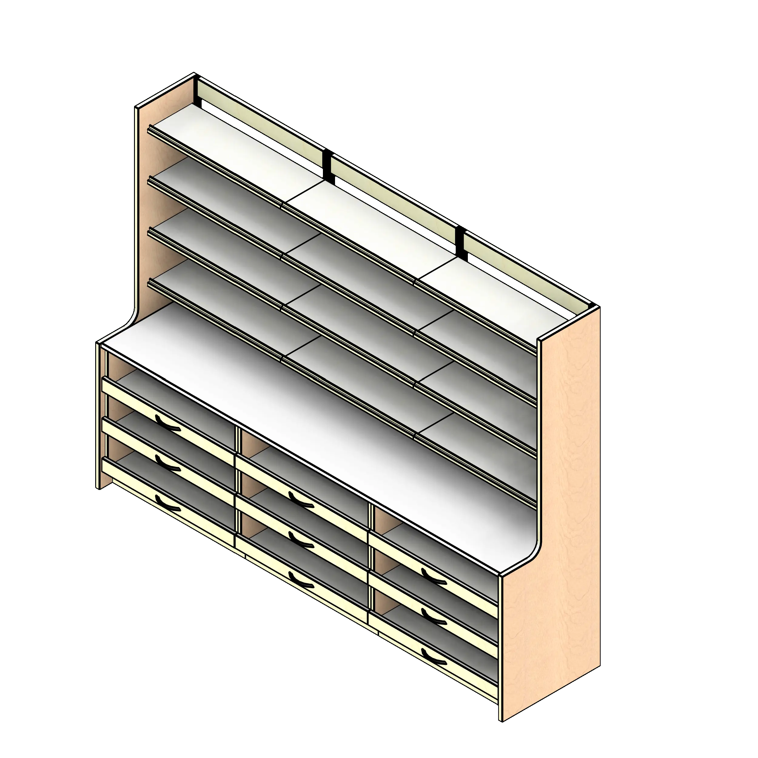 - Kit includes three tray drawer base cabinets, one countertop, twelve adjustable shelves, three back panels with openings cut out, and two side panels.