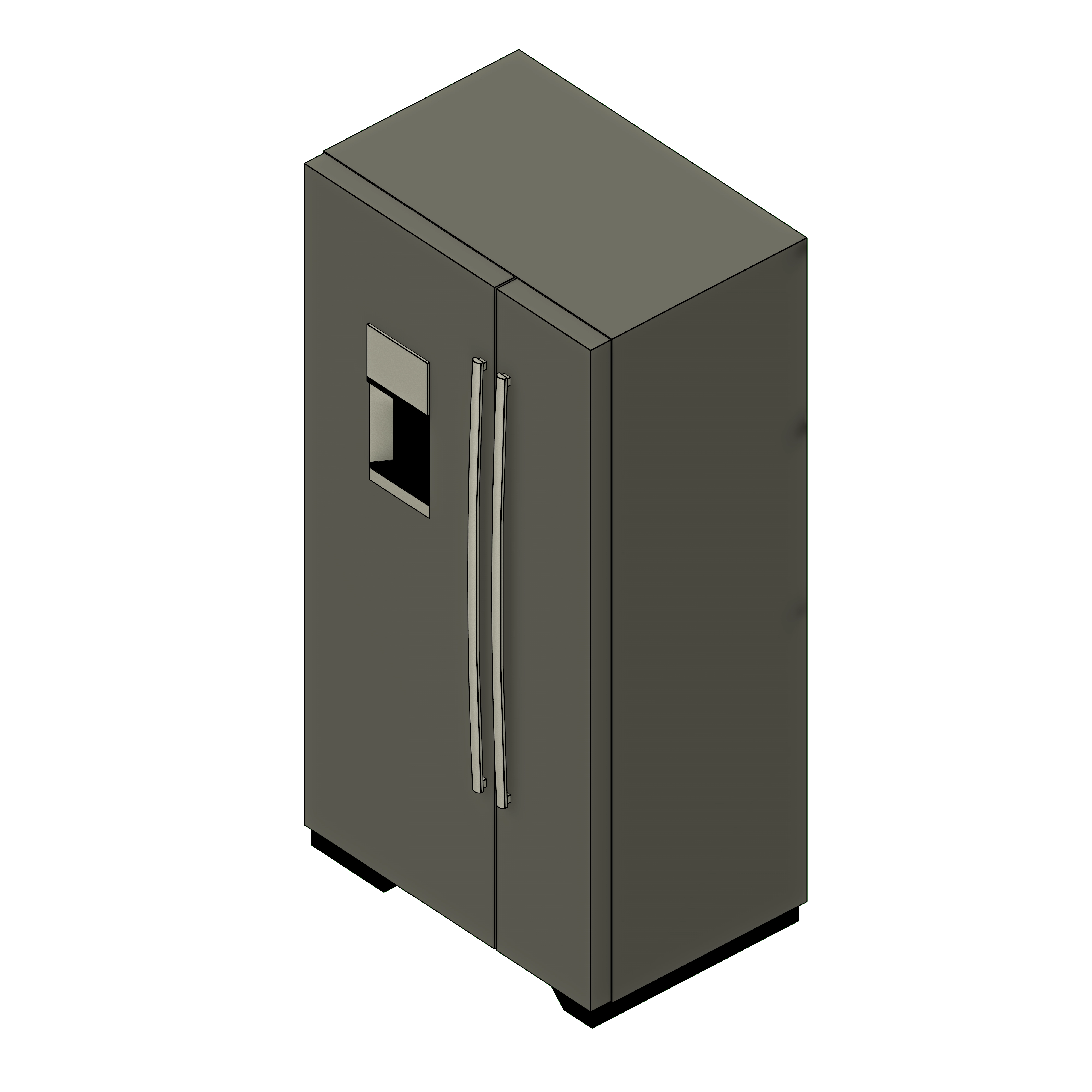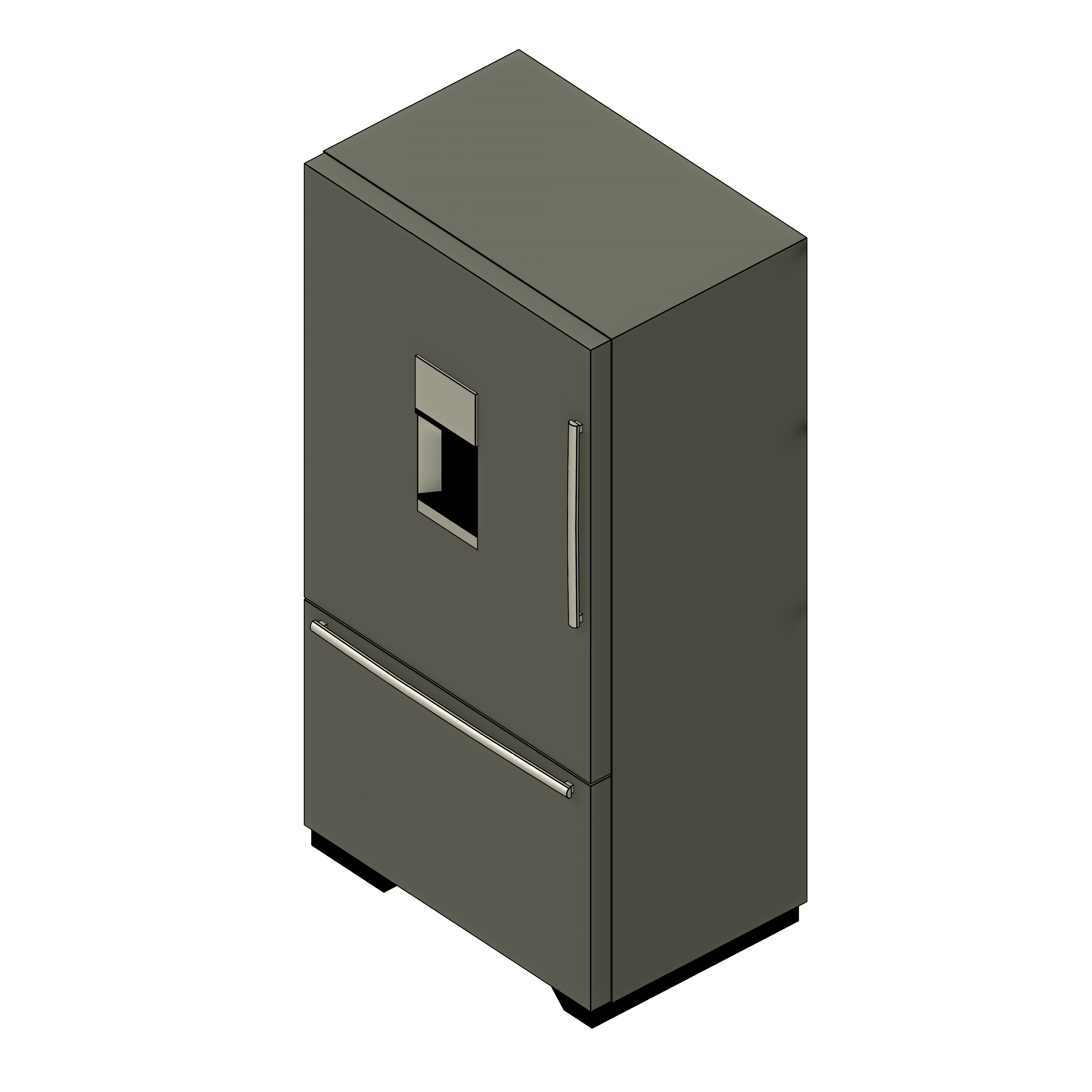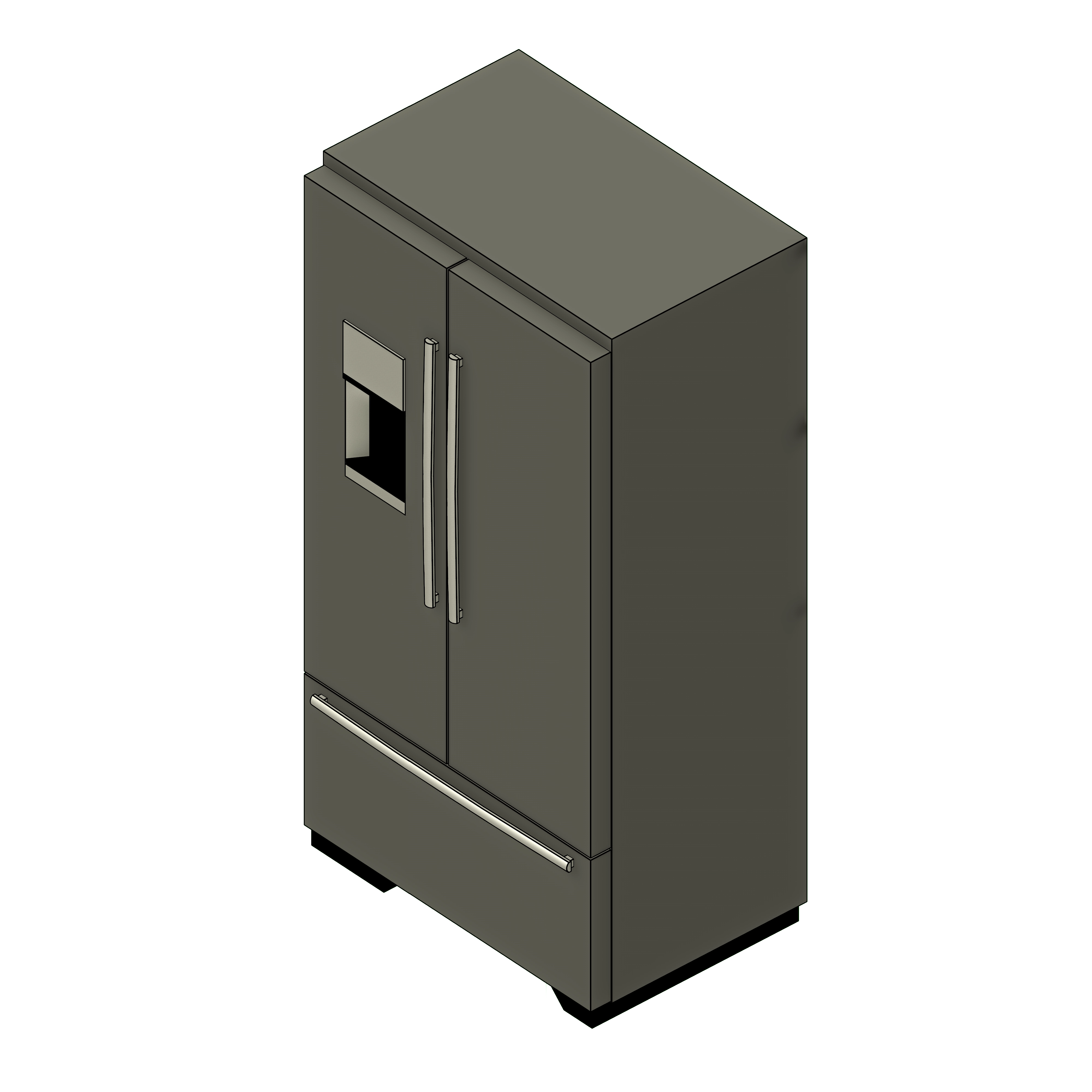 This simple and easy-to-use generic family could be added to a conceptual kitchen layout and modified as needed. There are four types of refrigerator options: top freezer, bottom freezer, french doors, and side-by-side with easy to plug-in and apply dimensions on the side properties to modify and adjust as needed. The door handles and water dispenser could be easily added or removed on the properties tab, along with the materials of each part of the refrigerators could be changed to your desired material or finish.